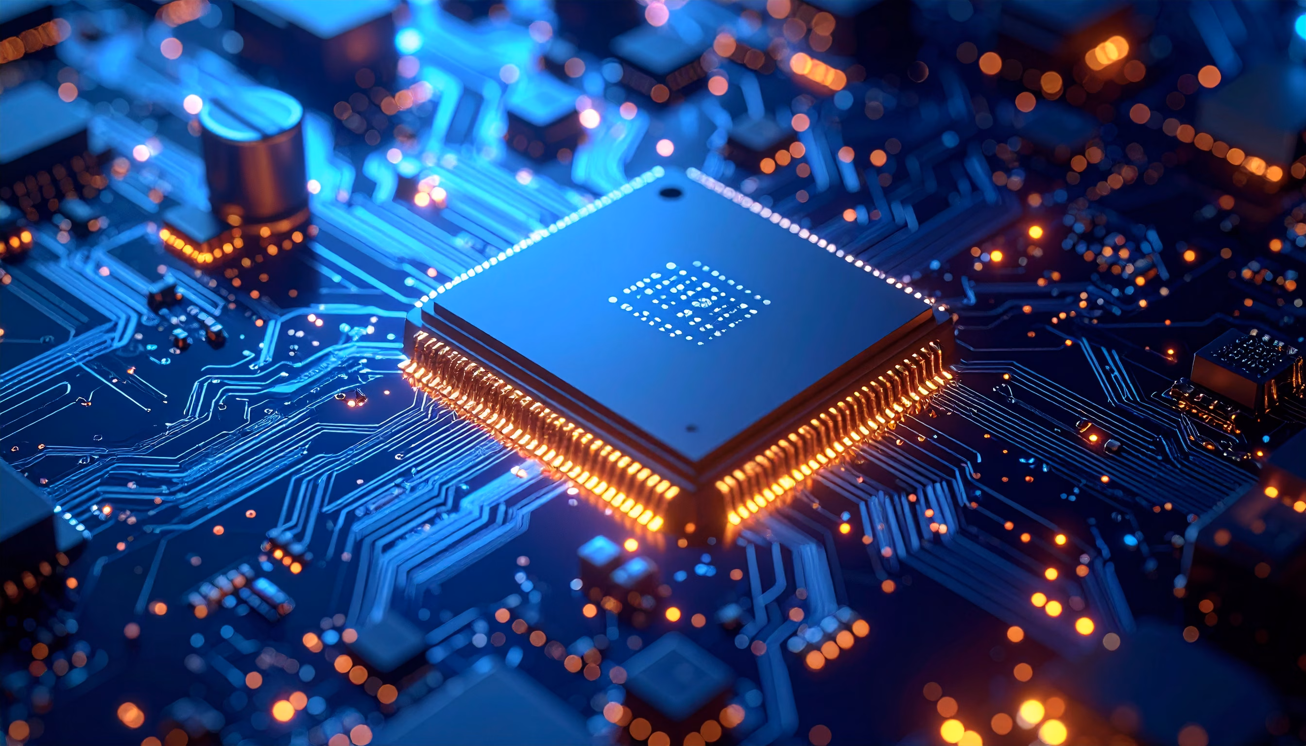 Explore this detailed image of a microchip on a motherboard, featuring illuminated circuits in blue and orange light, evoking a sense of technological innovation and precision. Perfect for showcasing advanced technology in your projects.