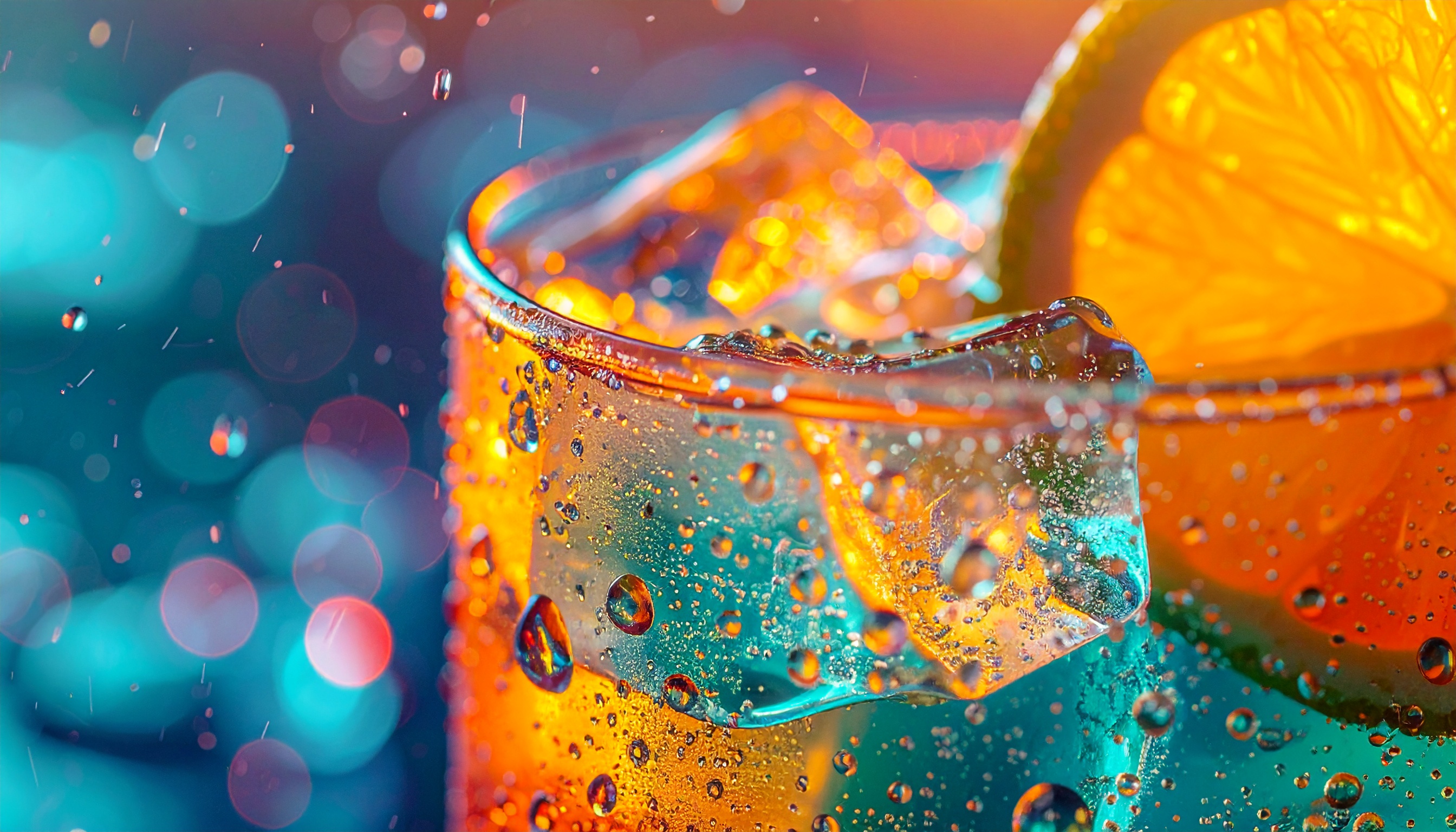 Copo com bebida gaseificada visto de perto, destacando cubos de gelo e bolhas efervescentes sob iluminação vibrante em tons de laranja e azul, criando um efeito visual colorido e refrescante.