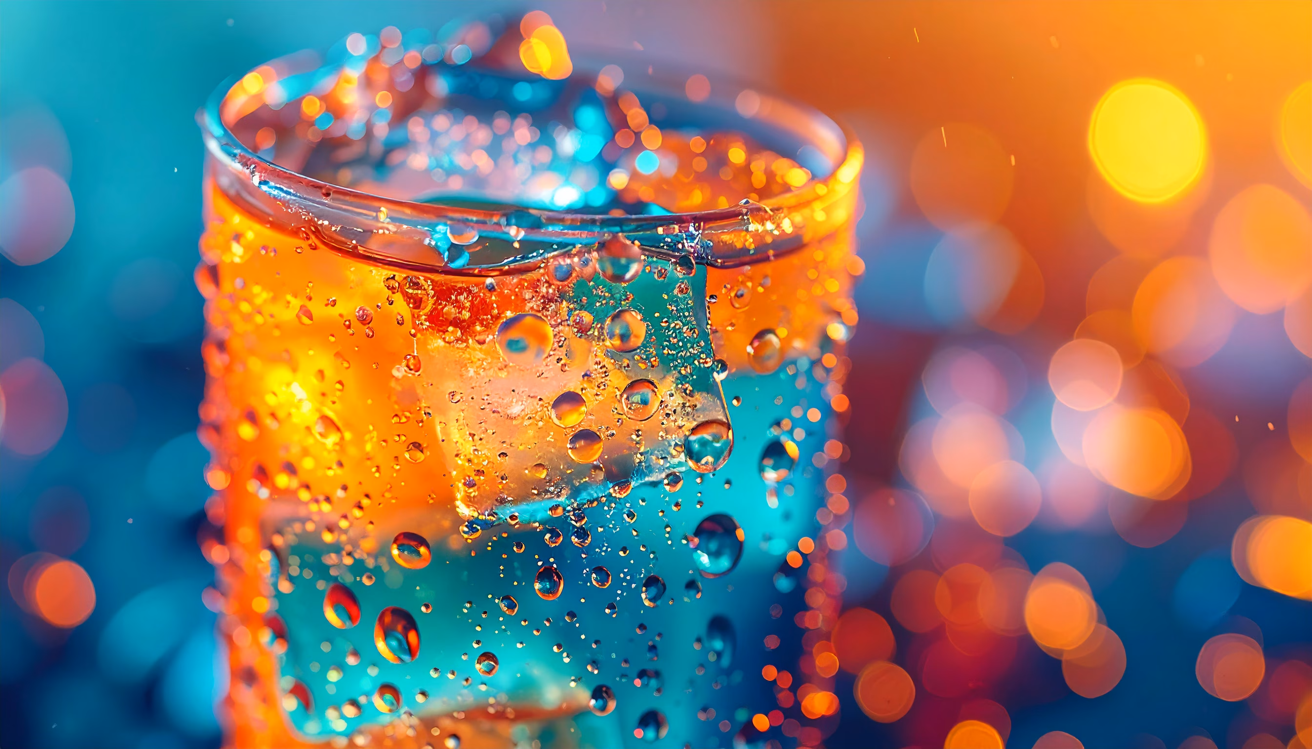 Close-up of a sparkling drink showcasing ice cubes and effervescent bubbles under vibrant orange and blue lighting, creating a colorful and refreshing visual effect. Perfect for beverage promotions or summer-themed projects.