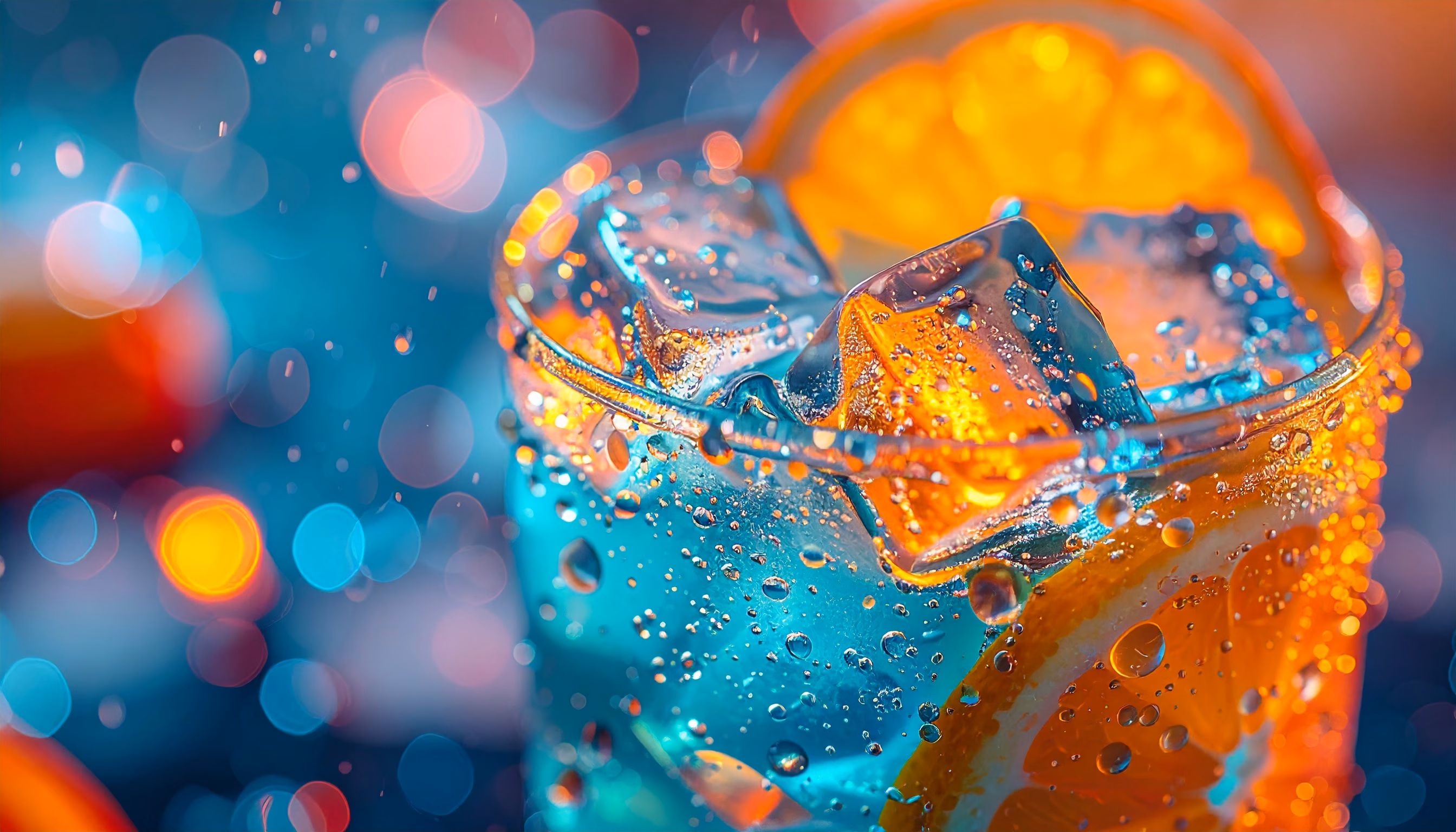 This vibrant image features a glass filled with ice and a slice of orange, set against a colorful bokeh background. The lighting highlights water droplets, creating a refreshing and festive atmosphere...