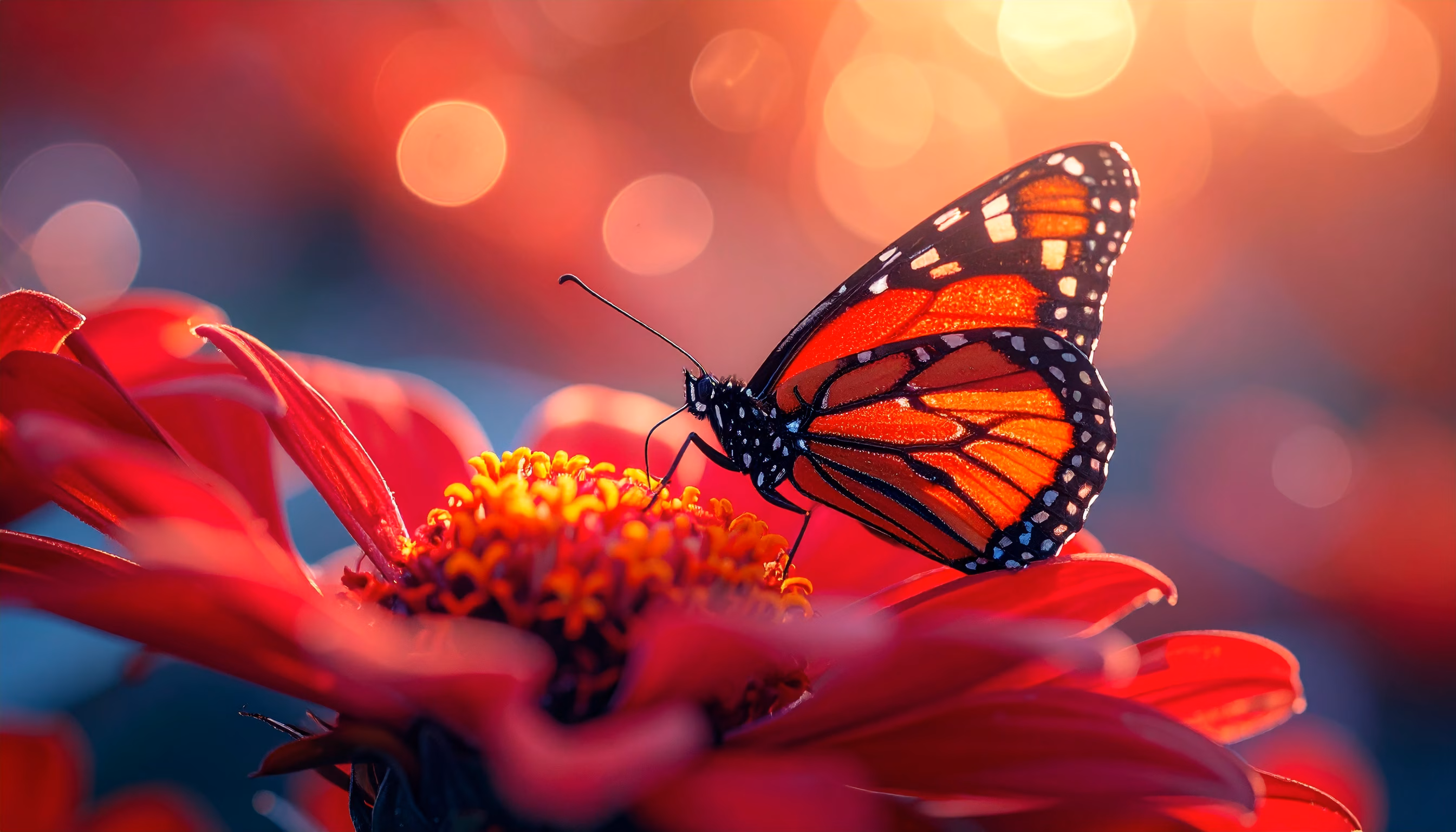 This image is classified with the tags: monarch butterfly, vibrant flower, sunset, nature, delicacy.