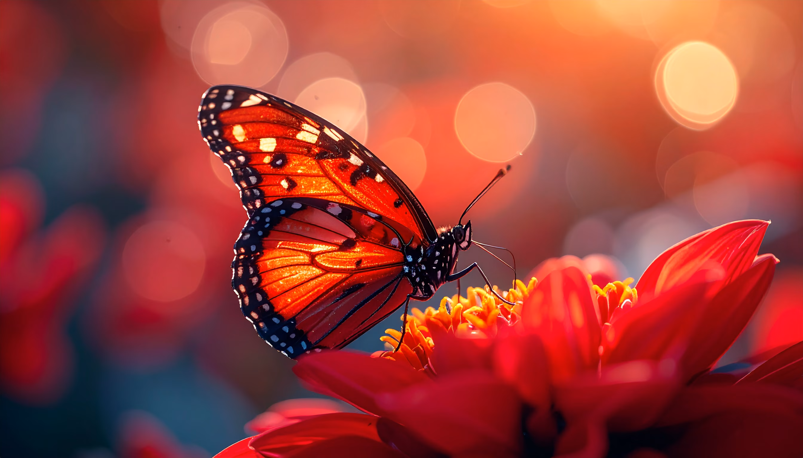 A stunning monarch butterfly rests on a vibrant red flower, illuminated by the soft light of sunset. Its orange wings stand out beautifully against a charming bokeh background, capturing the essence of nature's tranquility and beauty.