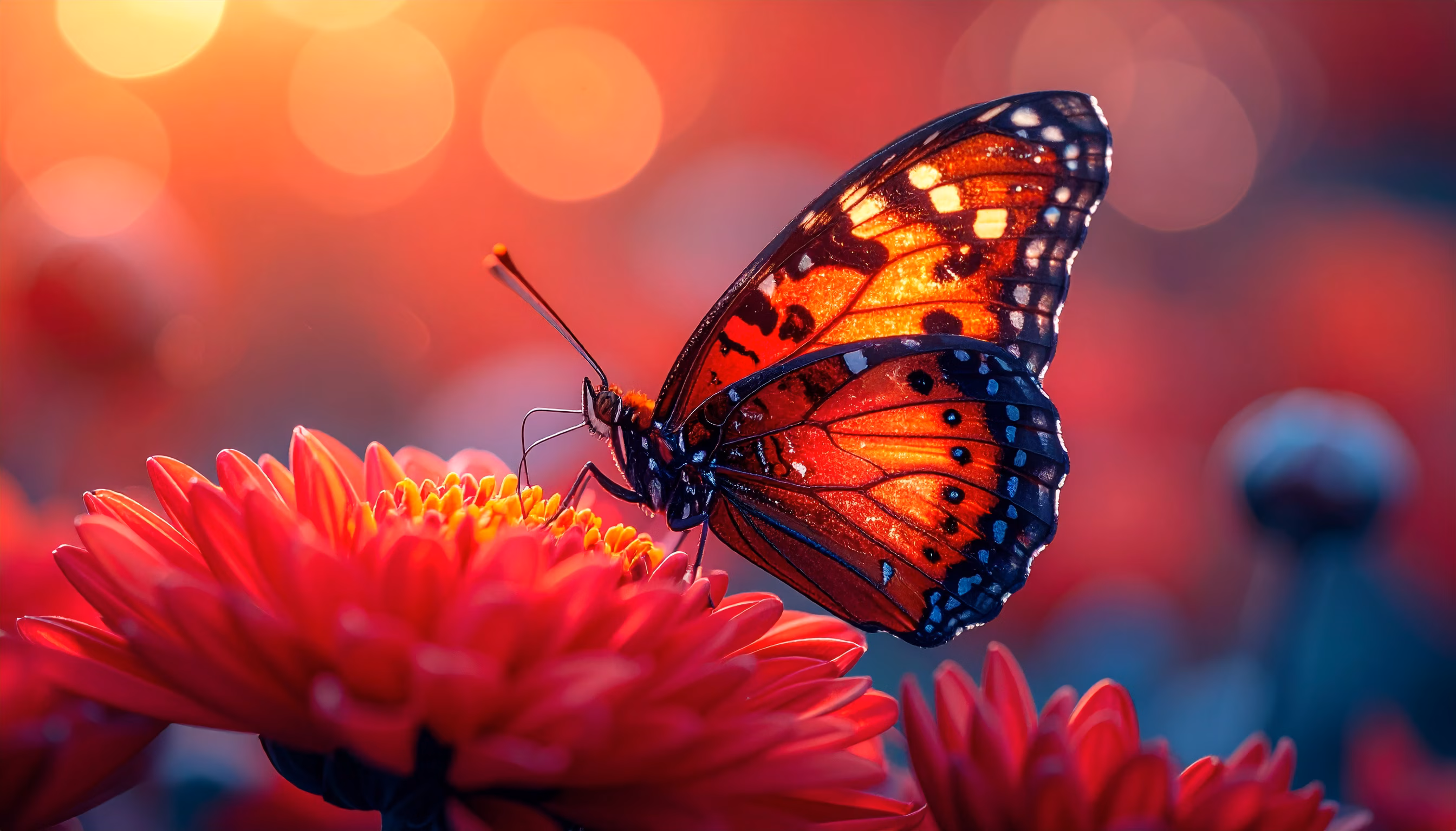 Discover the beauty of an orange and black butterfly resting on vibrant red flowers. This image features a softly blurred background with warm tones, creating an ethereal atmosphere perfect for nature lovers and creatives alike. Ideal for adding a touch of color and life to your projects.