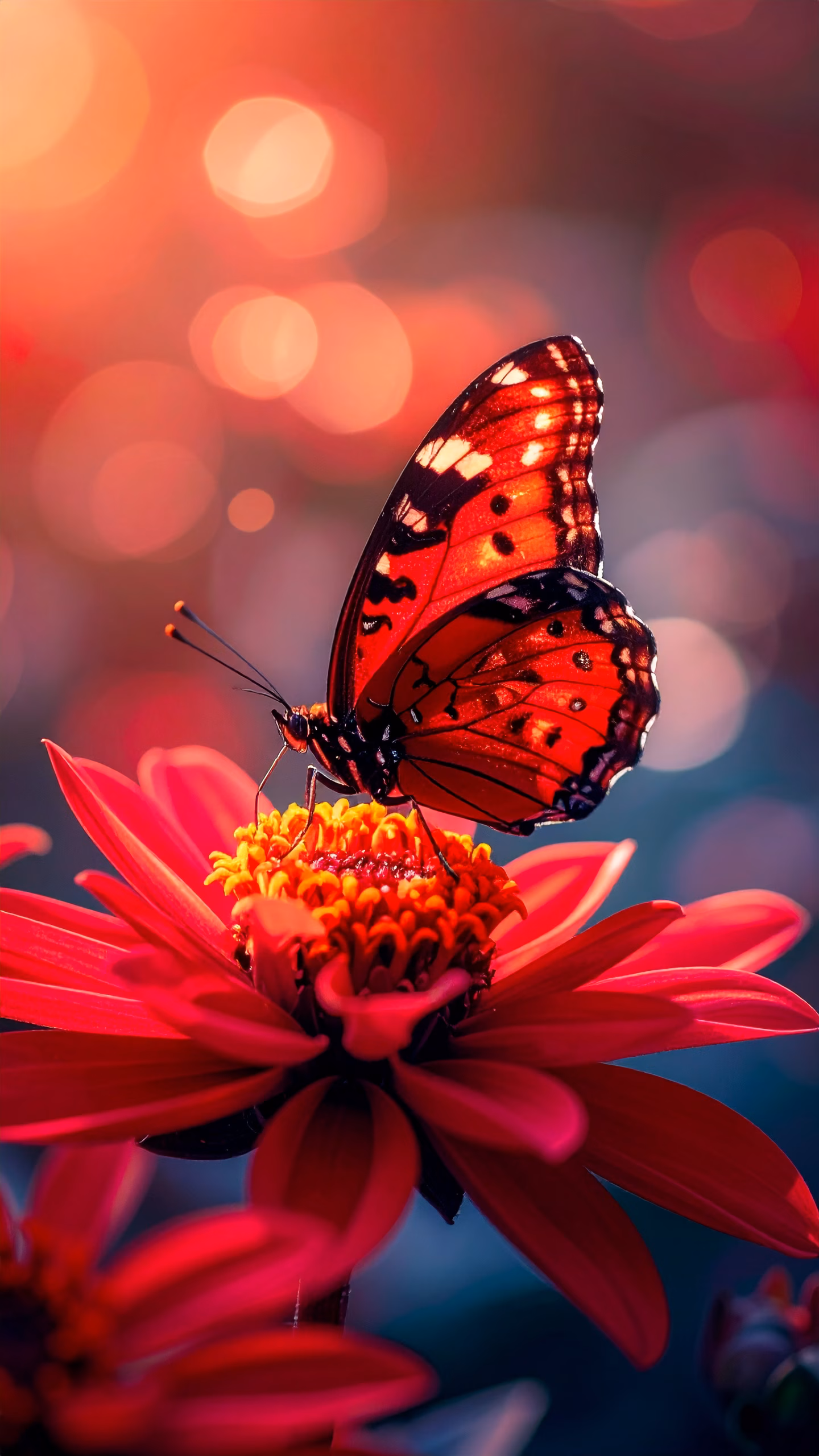 Discover a stunning image of a vibrant orange and black butterfly perched on a striking red flower, set against a warm, blurred background that creates a magical and ethereal atmosphere. Perfect for n...