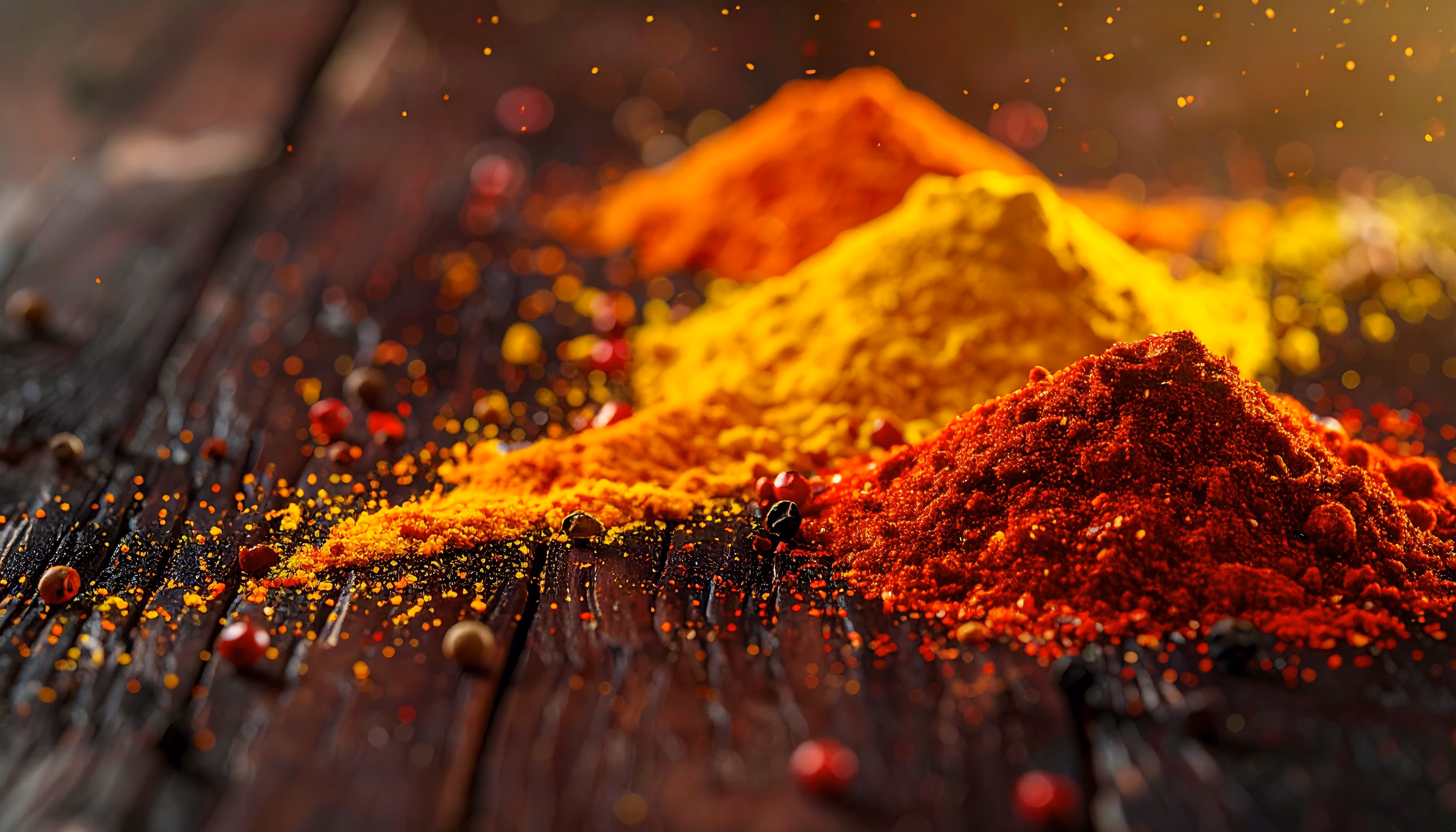 Colorful Spices in Red, Yellow, and Orange on Dark Wood