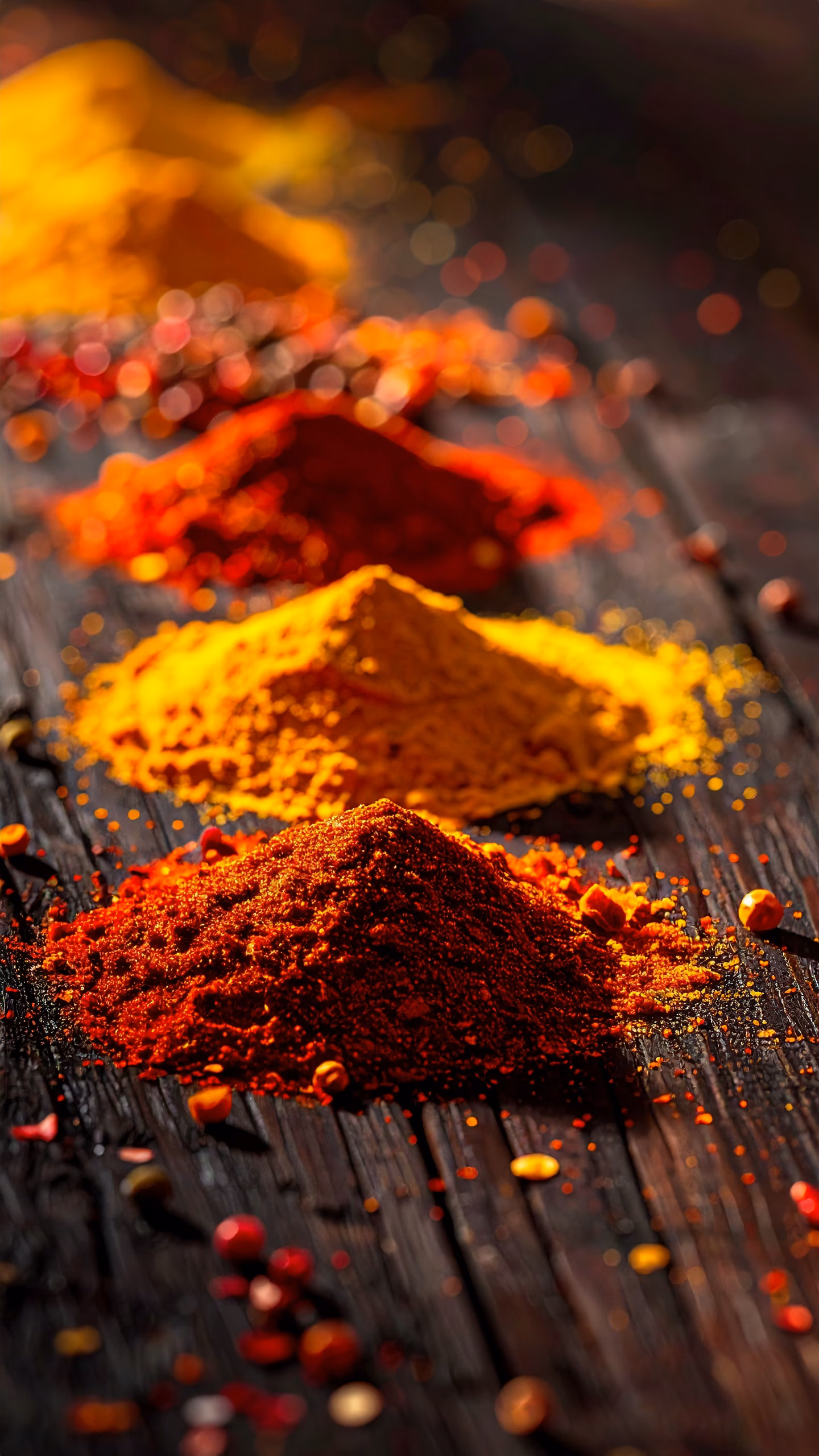 Discover vibrant mounds of spices in striking shades of red, orange, and yellow, dramatically illuminated against a dark wooden surface. This image captures the intense contrast and rich textures, per...