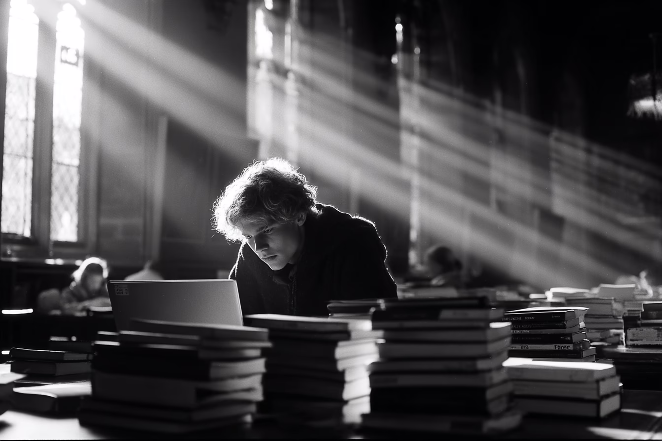 A focused young man working on a laptop in a brightly lit library, surrounded by stacks of black and white books. This scene captures a deep study environment and reflection, perfect for those seeking...