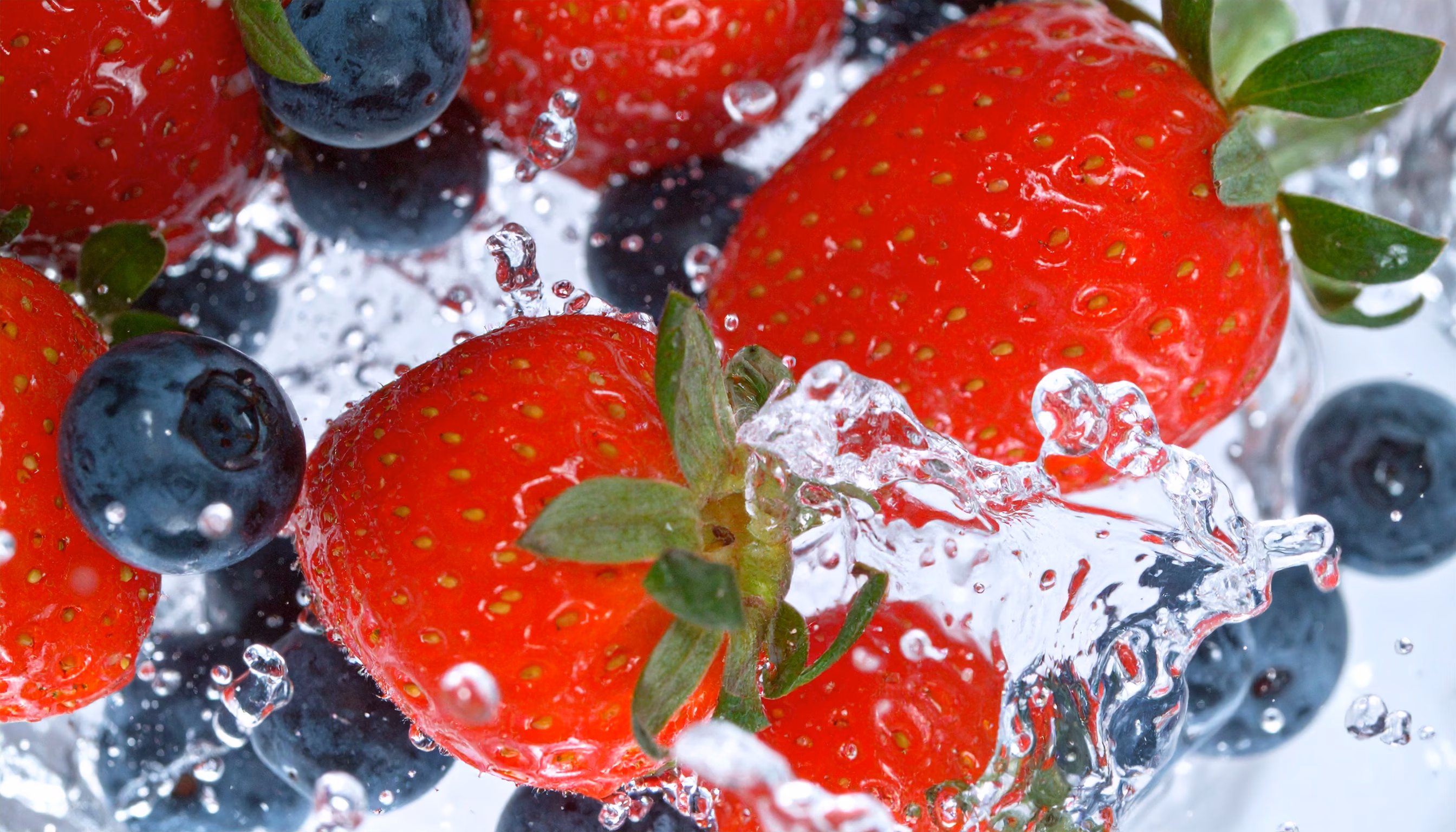 Vibrant Strawberries and Blueberries in Crystal Clear Water