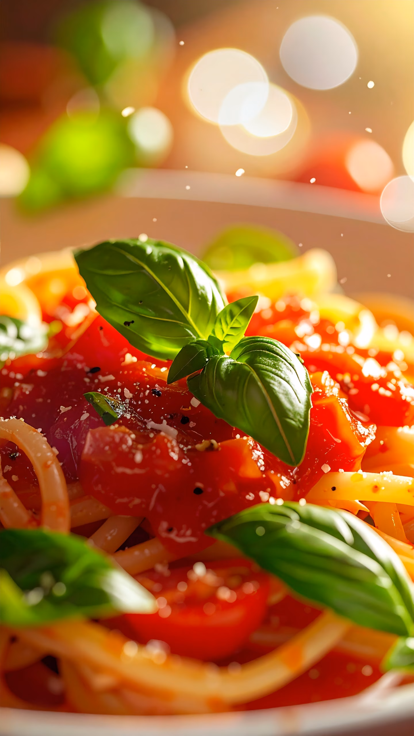 Indulge in this close-up shot of fresh tomato spaghetti, beautifully garnished with basil leaves. The warm, soft lighting enhances the vibrant textures of the ingredients, creating an appetizing atmosphere with a colorful bokeh background. Perfect for food lovers and culinary enthusiasts looking to,