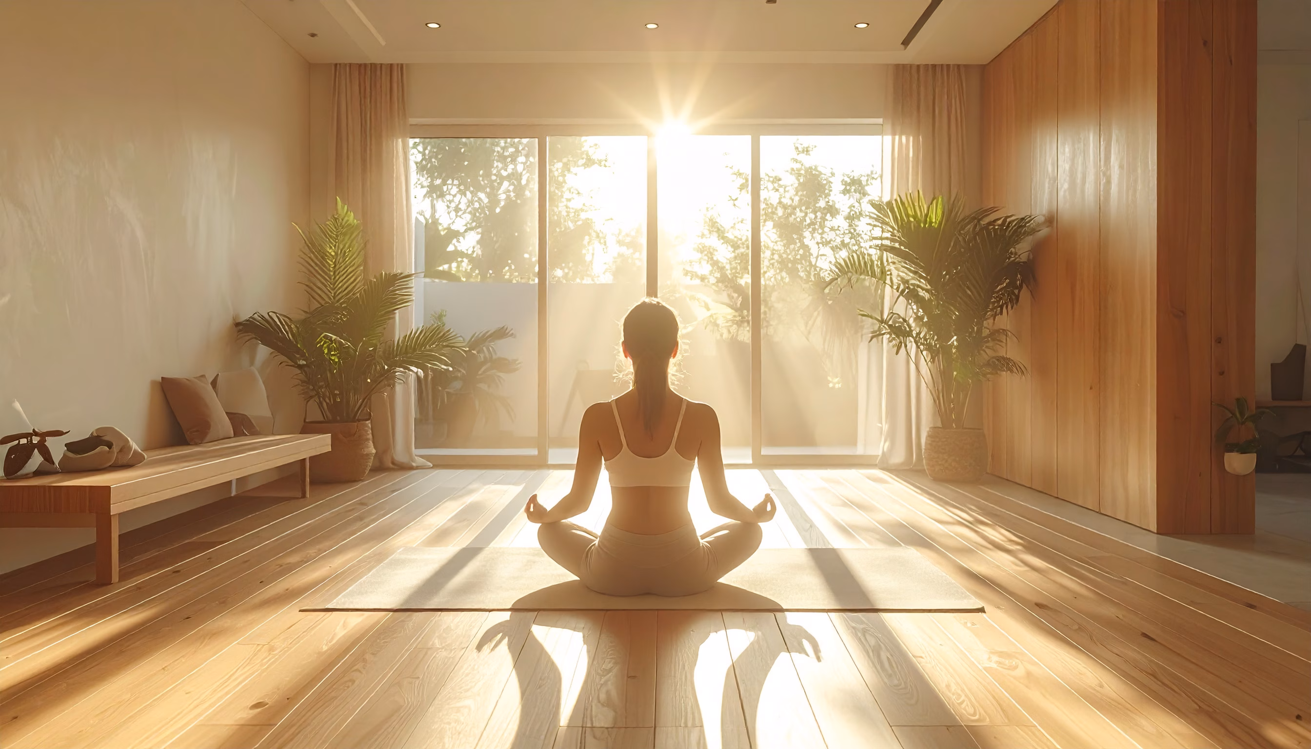 A serene scene of a woman meditating in a sunlit room, surrounded by plants and wooden flooring. The soft light highlights her silhouette, while the minimalist decor and centered angle emphasize the t...