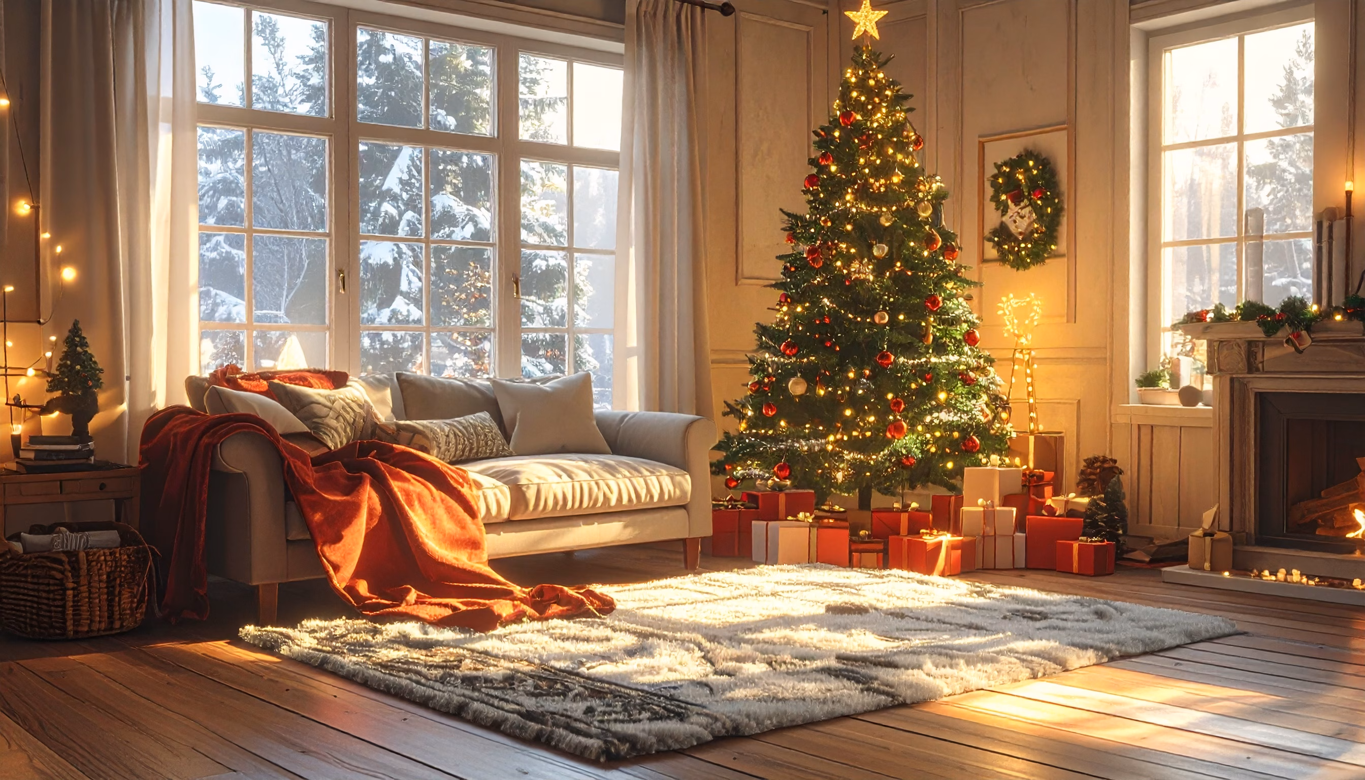Experience the warmth of a beautifully decorated Christmas living room featuring an illuminated tree adorned with red and gold ornaments. A cozy sofa draped with a red blanket invites relaxation, whil...