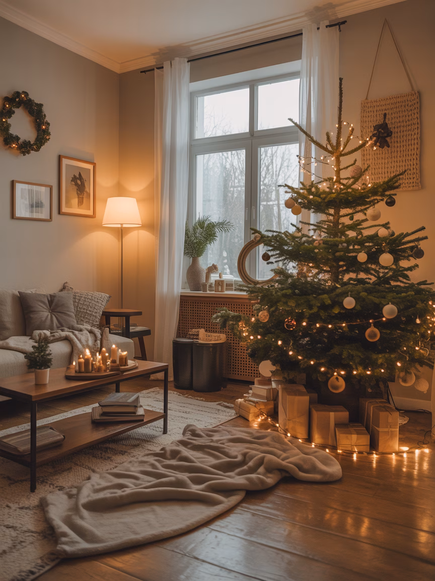 Experience the warmth of a beautifully decorated Christmas living room featuring a glowing tree adorned with ornaments and wrapped gifts. A comfortable sofa with a blanket, a coffee table with lit candles, and soft lighting create a welcoming atmosphere. The minimalist decor and window in the back,