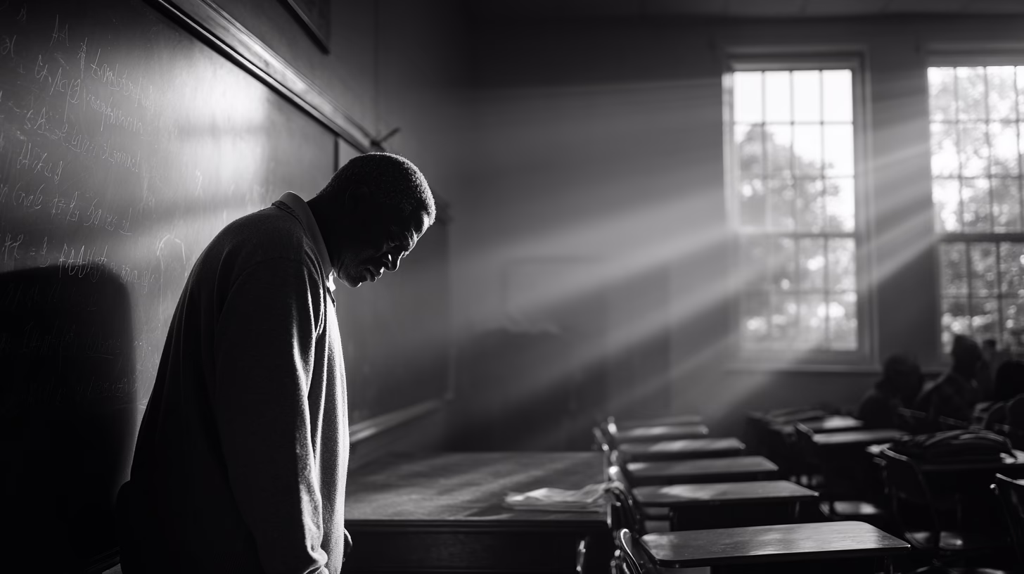 This black and white image captures a dramatic classroom environment with striking lighting. Rays of light filter through the windows, illuminating the space. A man leans over a table, deep in thought, while a chalkboard in the background displays notes. The scene includes desks and chairs visible,,