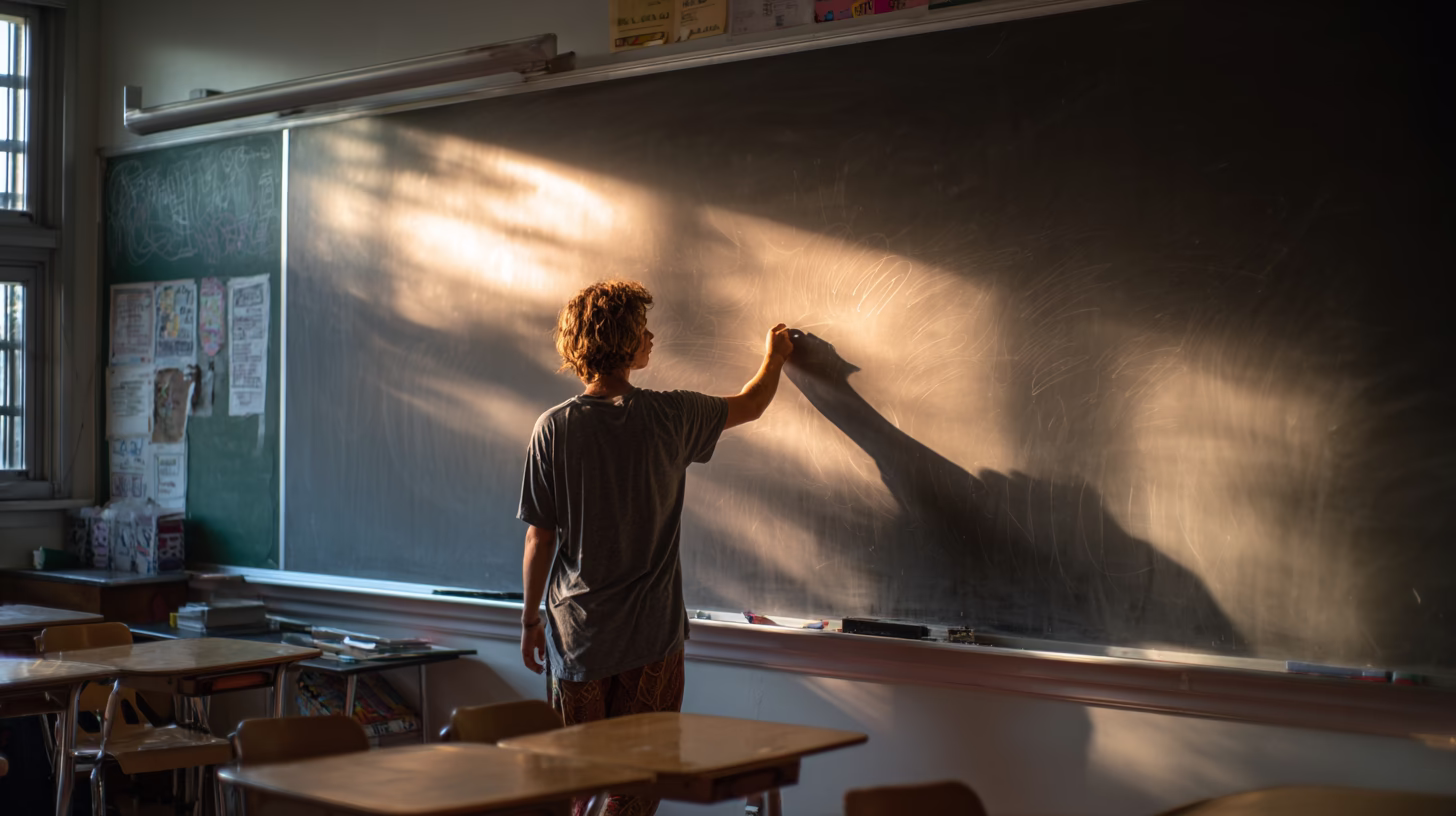 A student is writing on a chalkboard in a sunlit classroom, with school desks in the background. This scene captures the essence of learning and creativity in an educational environment, perfect for showcasing the importance of education.