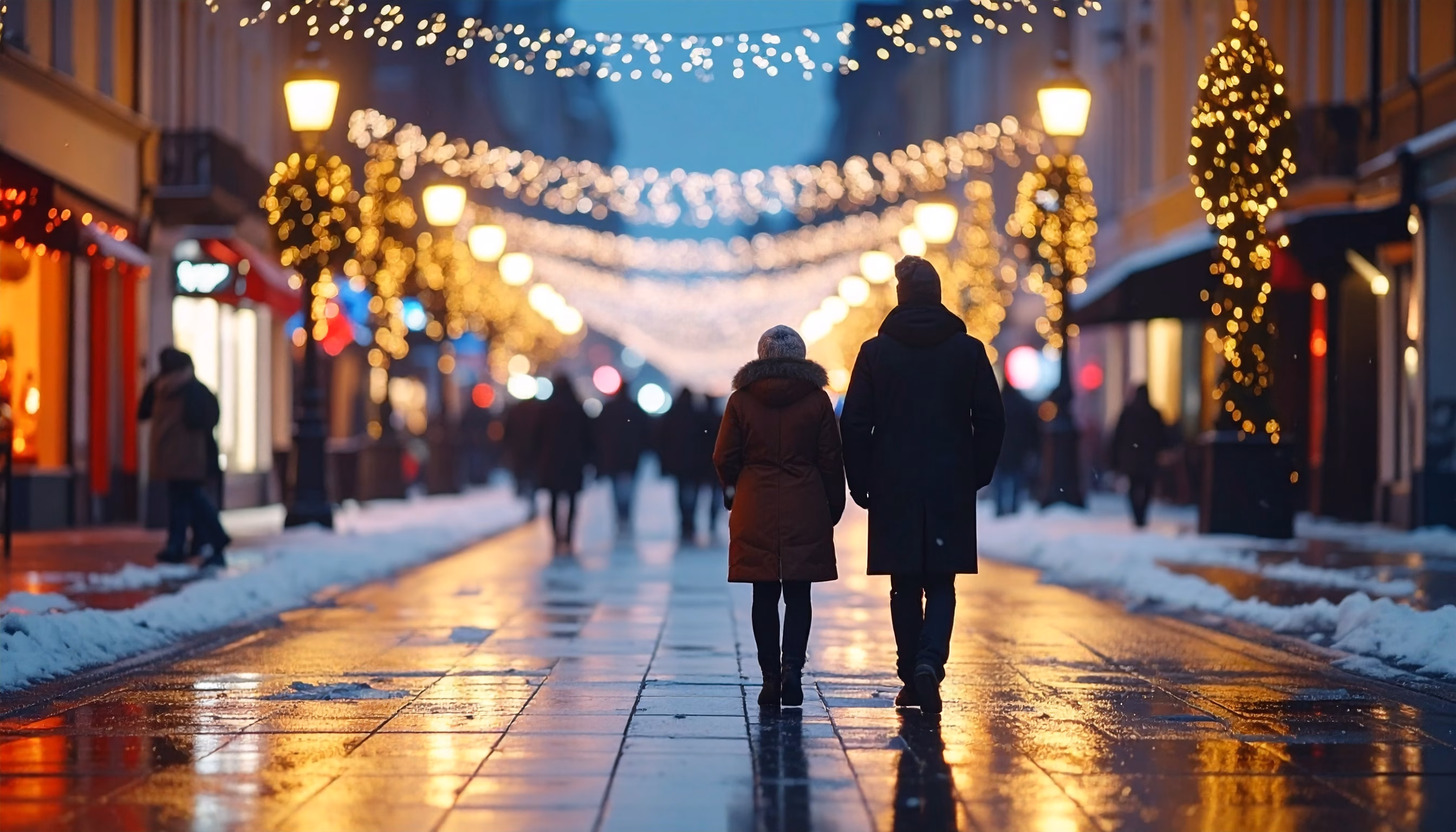 A couple strolls hand in hand down a street adorned with Christmas lights, creating a magical and romantic winter urban atmosphere. Perfect for capturing the essence of holiday romance in the city.