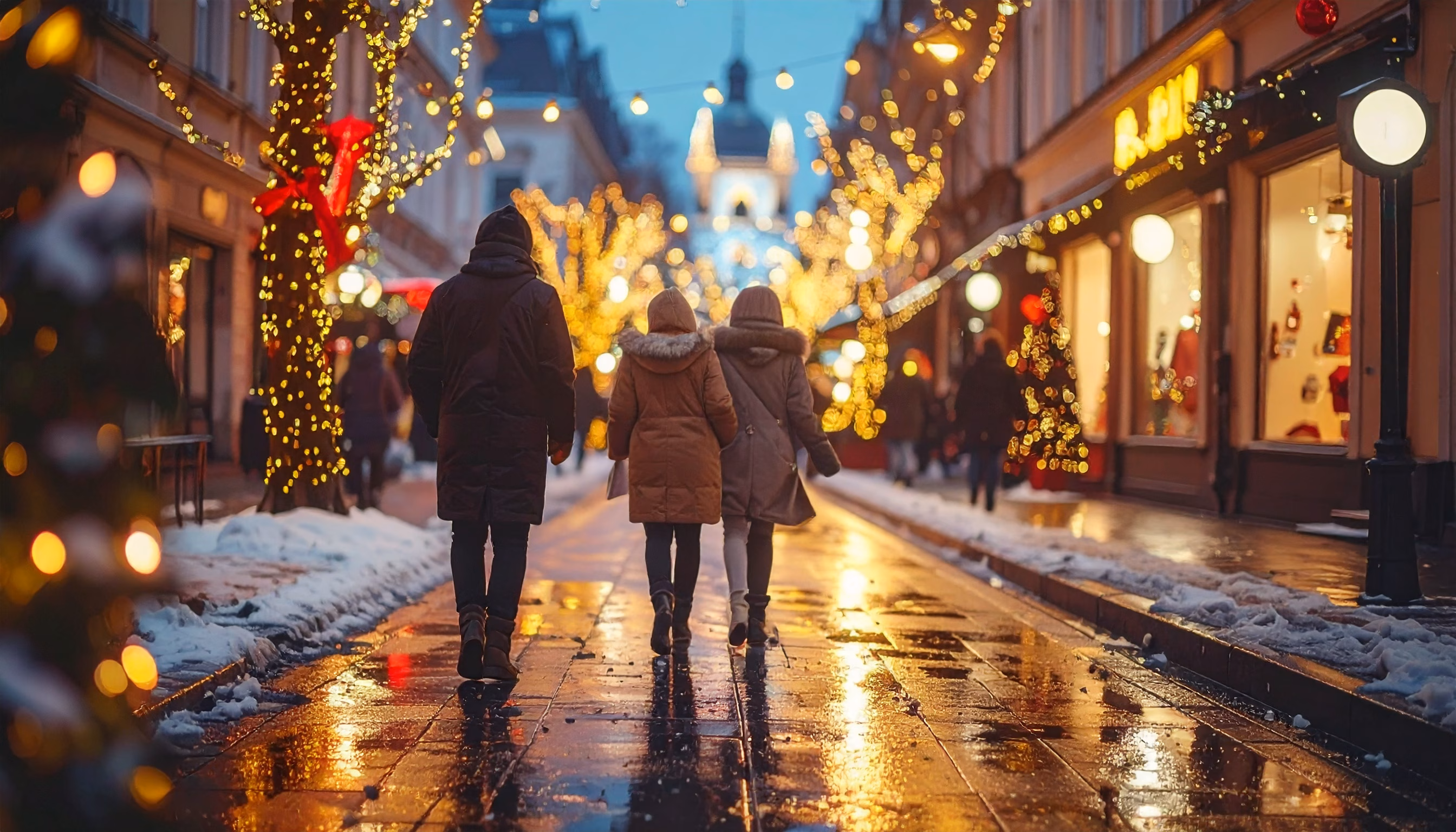 Experience the charm of a Christmas-lit street where three people stroll along a wet pavement, reflecting the warm glow of festive lights. The scene captures a cozy atmosphere with holiday decorations...