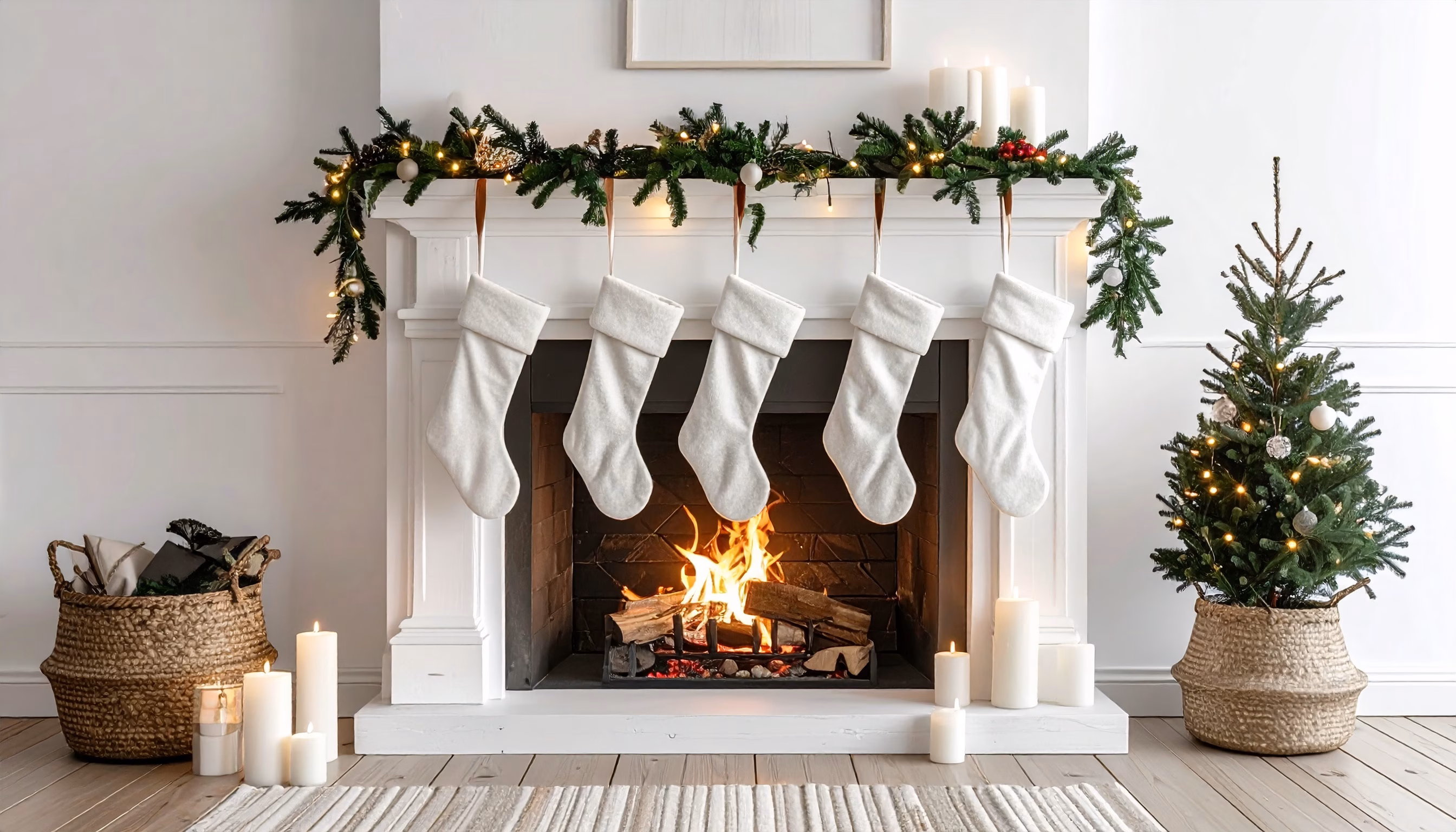 Experience the warmth of a beautifully decorated Christmas living room featuring a glowing fireplace, white stockings hung with care, and lush green garlands. The scene is enhanced by lit candles and a sparkling Christmas tree, creating a festive and inviting atmosphere. The elegant composition, in
