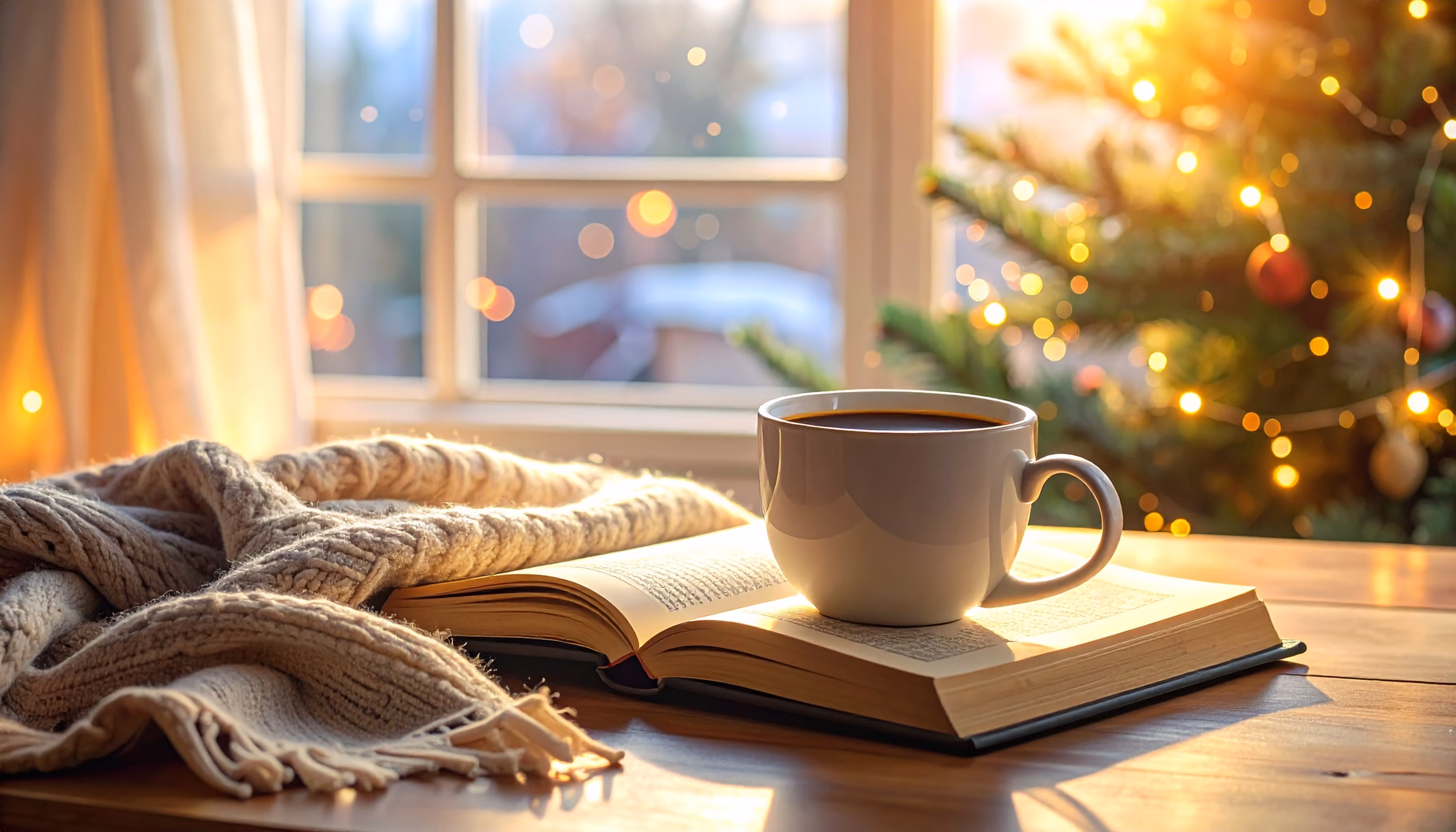 Experience the warmth of winter with this cozy scene featuring a cup of coffee on an open book beside a knitted blanket and a beautifully lit Christmas tree in the background. Perfect for evoking feelings of comfort and tranquility during the festive season.