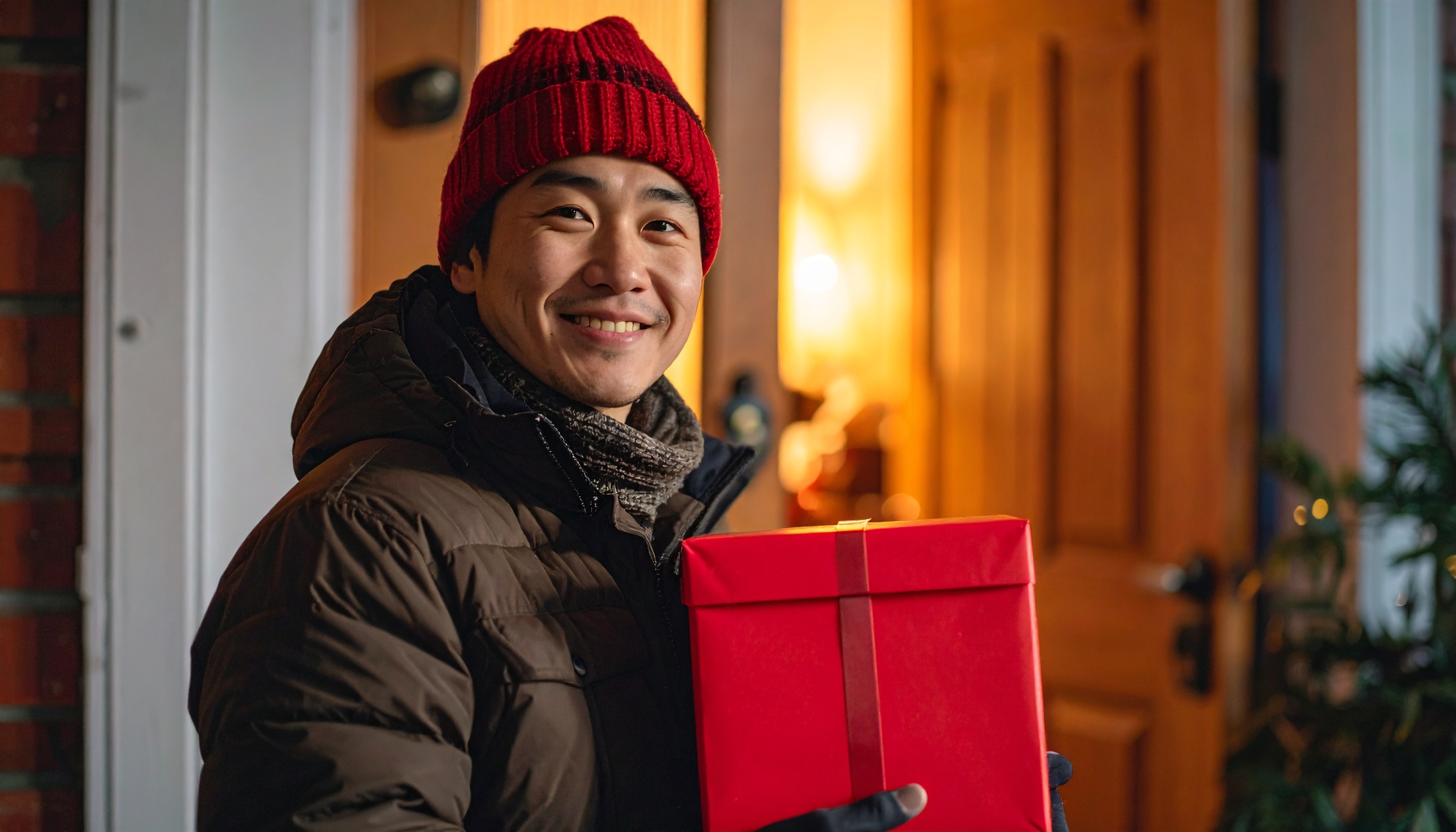Homem sorridente de gorro e cachecol segura presente vermelho em frente a porta de madeira, transmitindo calor humano e alegria natalina em ambiente acolhedor e iluminado.