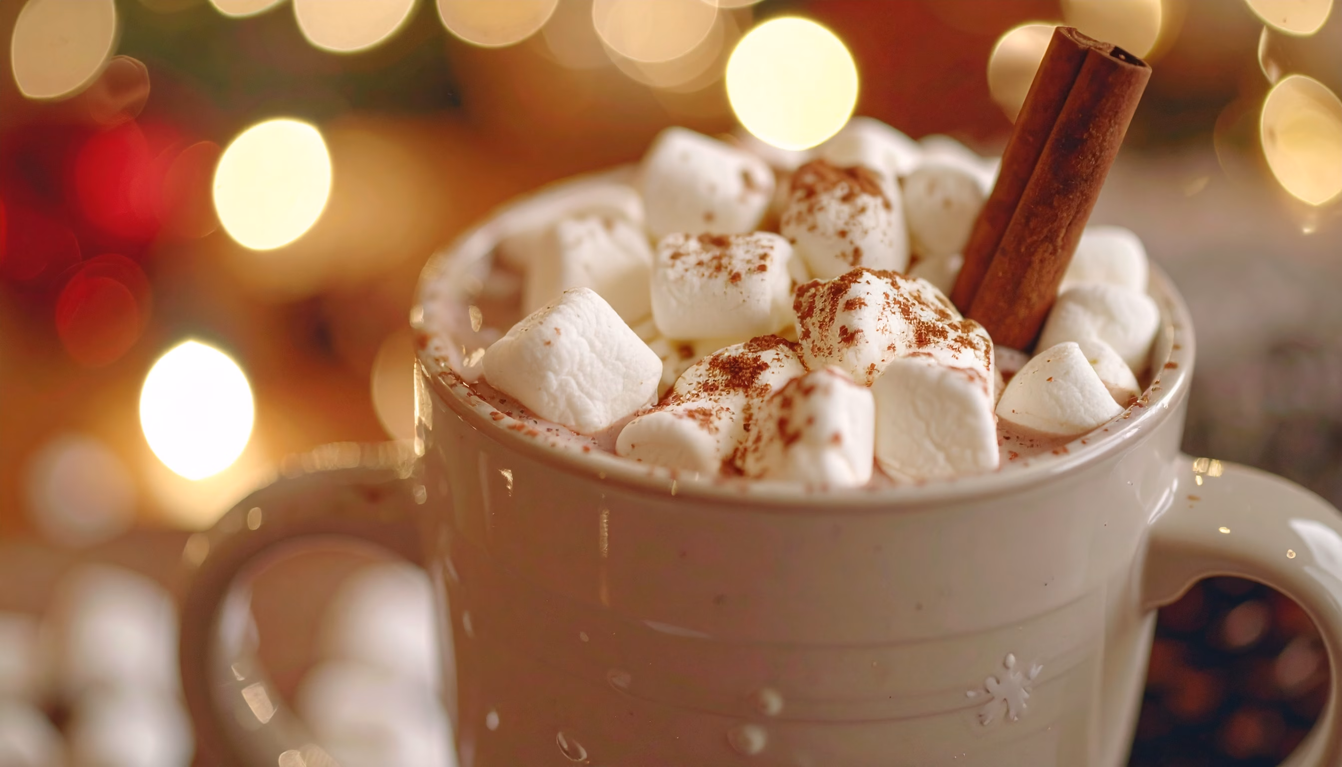 Experience the warmth and comfort of the holidays with this hot chocolate mug topped with marshmallows and cinnamon. Set against a cozy Christmas backdrop with soft lights and a bright bokeh effect, this image captures the essence of winter relaxation and festive cheer.