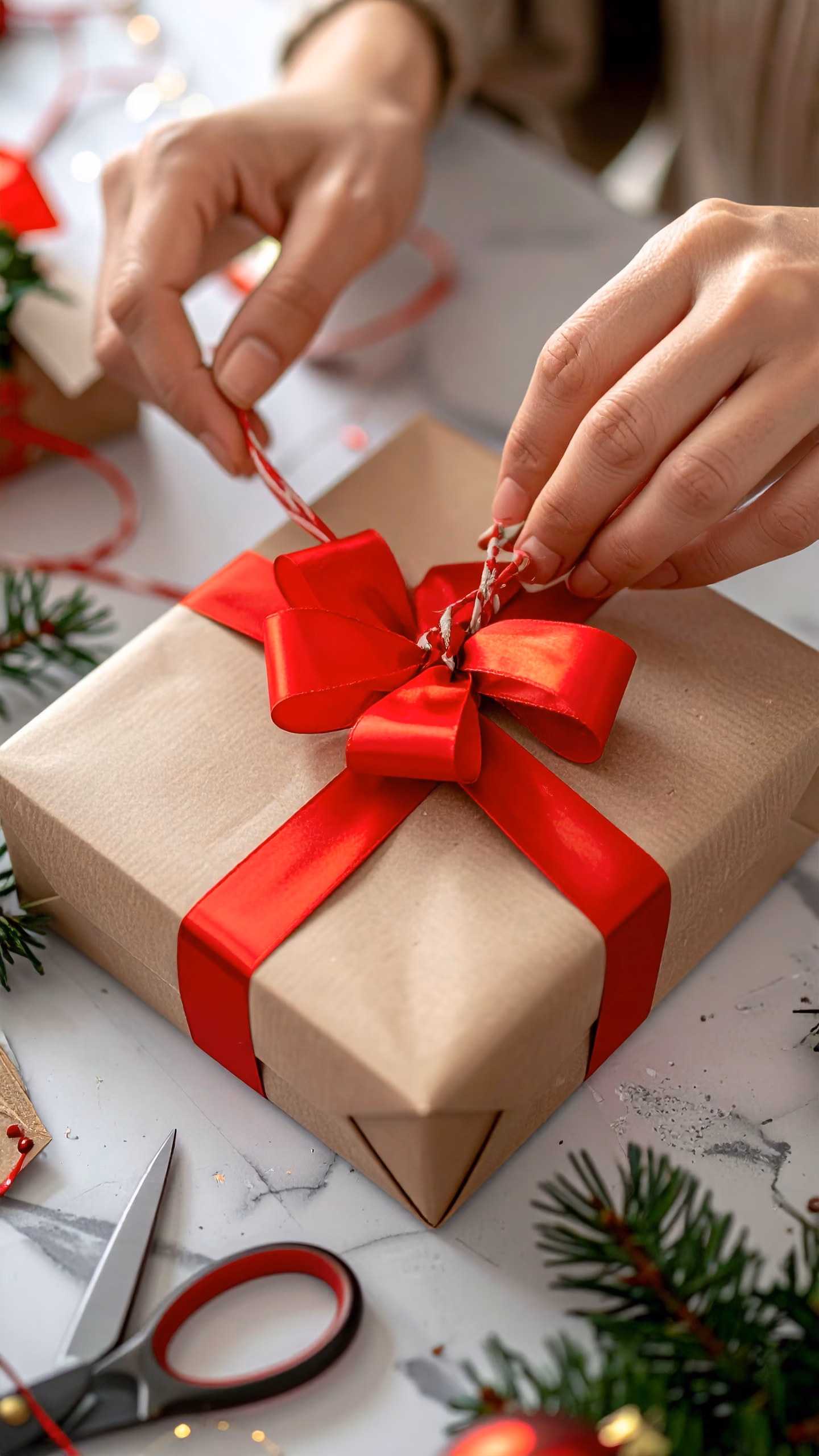 Hands tying a red ribbon on a gift wrapped in kraft paper, set in a well-lit and festive scene with Christmas decorations around, including green branches and scissors, creating an atmosphere of care ...