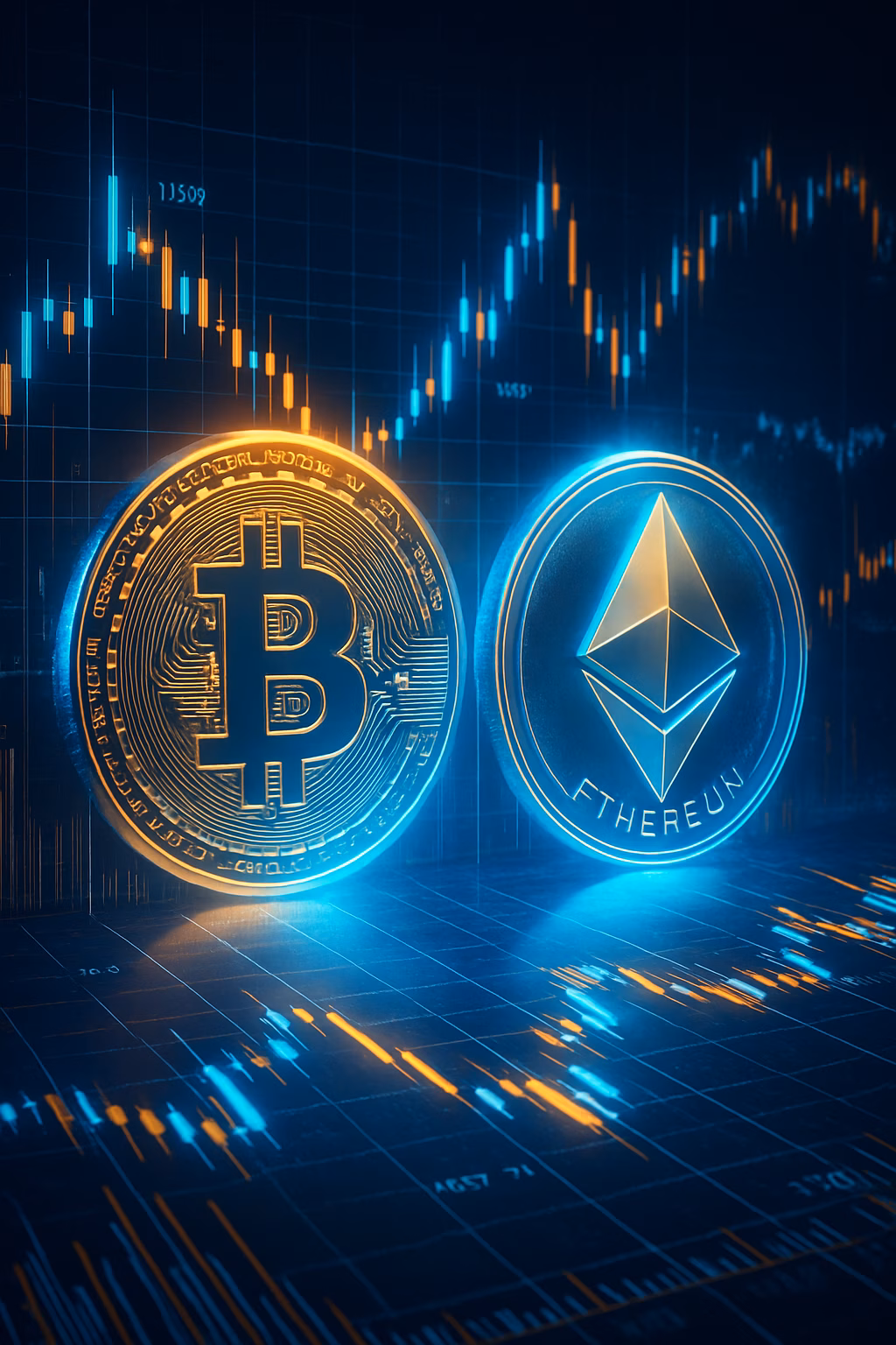 Explore this captivating digital image featuring Bitcoin and Ethereum coins illuminated in golden and blue tones, set against a backdrop of financial graphs. This artwork highlights market trends with...