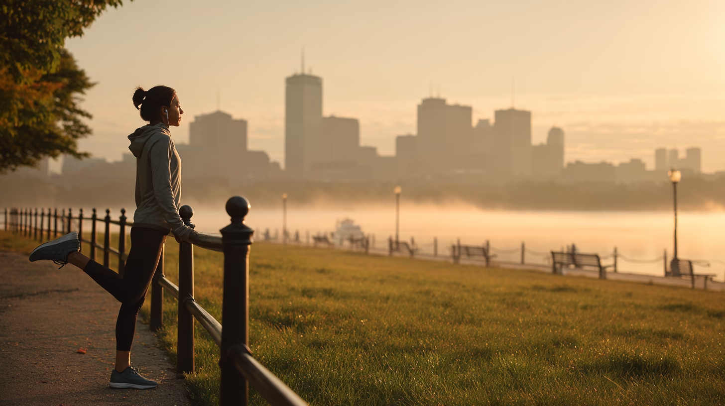 A woman stretching at the edge of a park during sunrise, with the city skyline in the background and mist over the lake. She is seen from the side, wearing workout clothes and headphones, enjoying the...