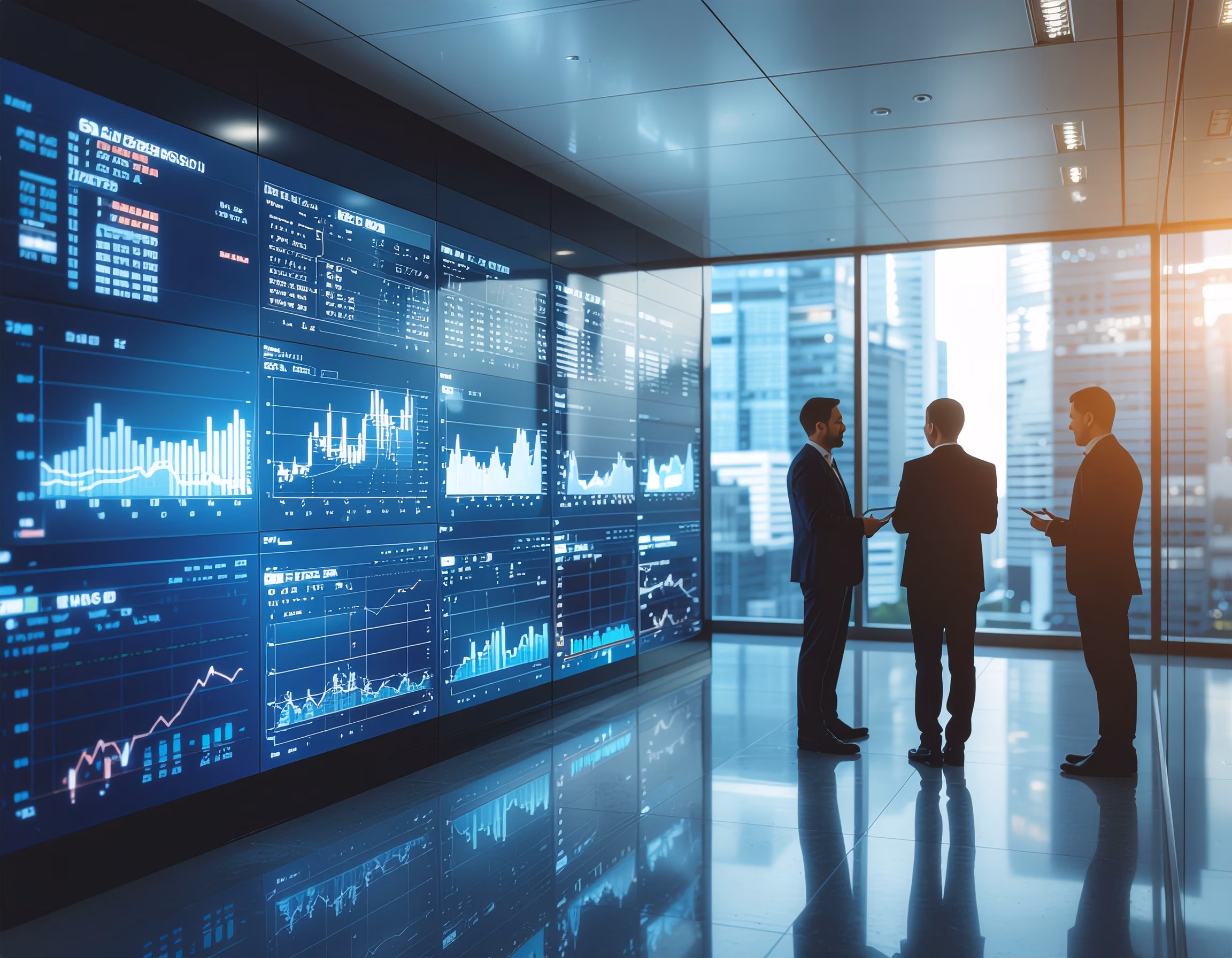 Three executives engage in a finance discussion in a modern office featuring large screens displaying market graphs, showcasing a futuristic and collaborative business environment.