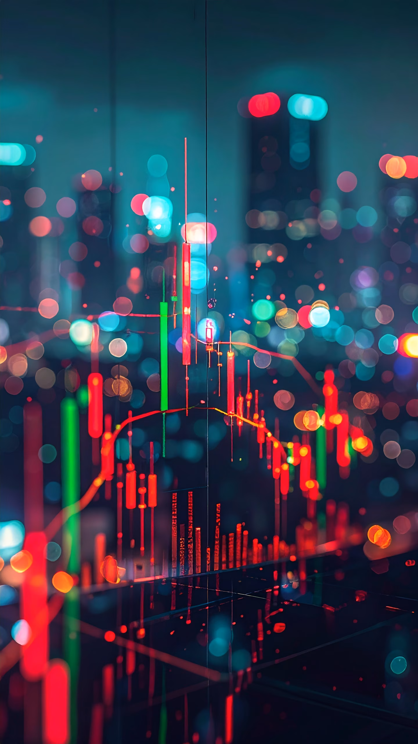 Explore vibrant financial candlestick charts in the foreground, set against a blurred urban backdrop filled with colorful lights. This dynamic composition features bright blue, red, and green hues, emphasizing the volatility and movement of the financial market. The depth of field suggests a lively,