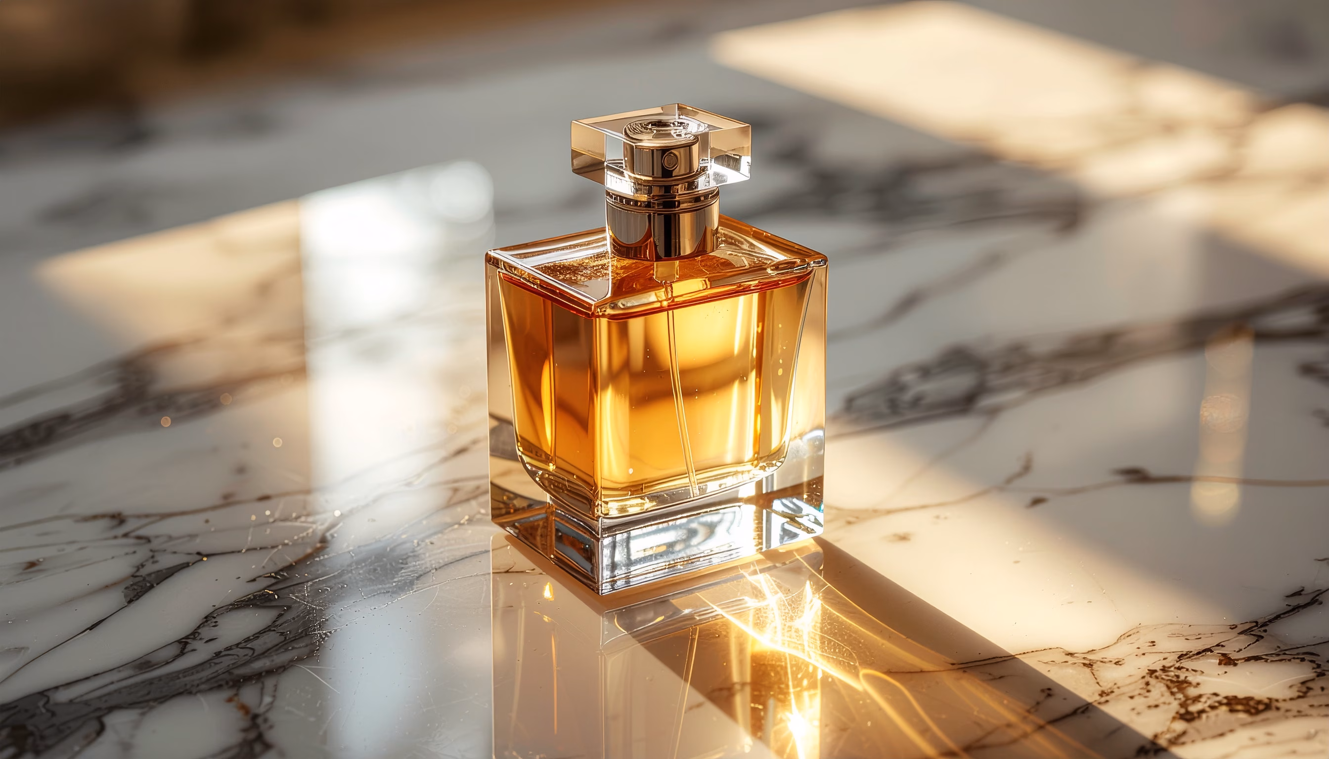 Discover this elegant amber perfume bottle resting on a white marble surface with dark veins. Captured in soft, diffused light, the image highlights the luminous reflection and transparency of the gla...