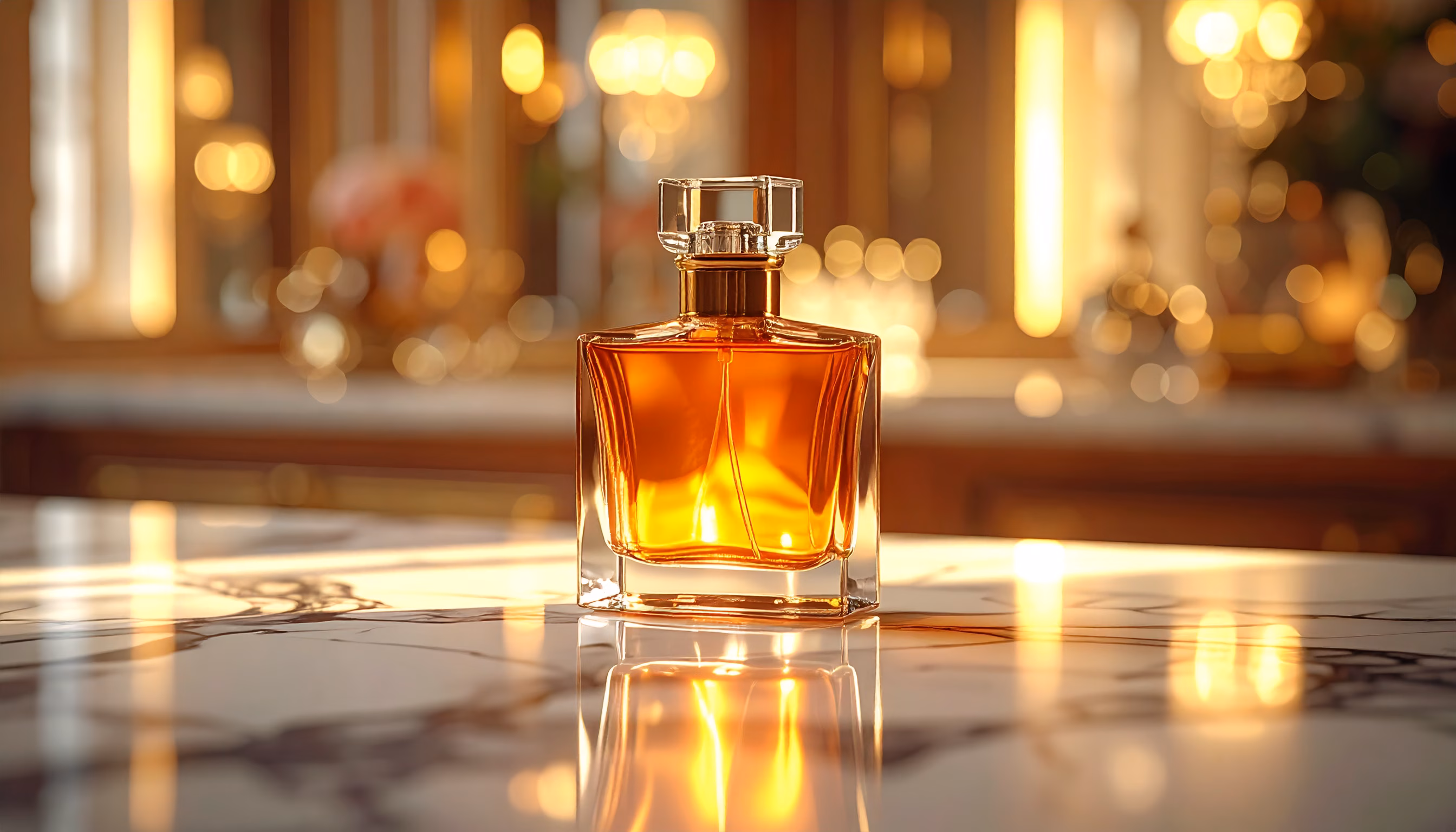 Discover the elegance of this luxury amber glass perfume bottle, beautifully illuminated with warm, soft lighting. Its minimalist design on a marble surface exudes sophistication, while the blurred golden background adds a touch of refinement and exclusivity. Perfect for those seeking a high-end, op