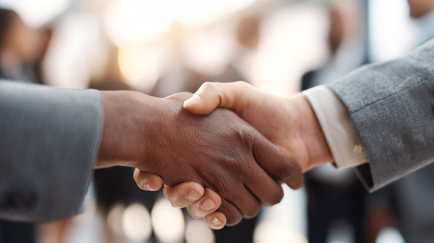 This close-up image captures two hands shaking in a professional setting, symbolizing agreement and collaboration. It highlights diversity in professional interactions, focusing on a firm and confiden...