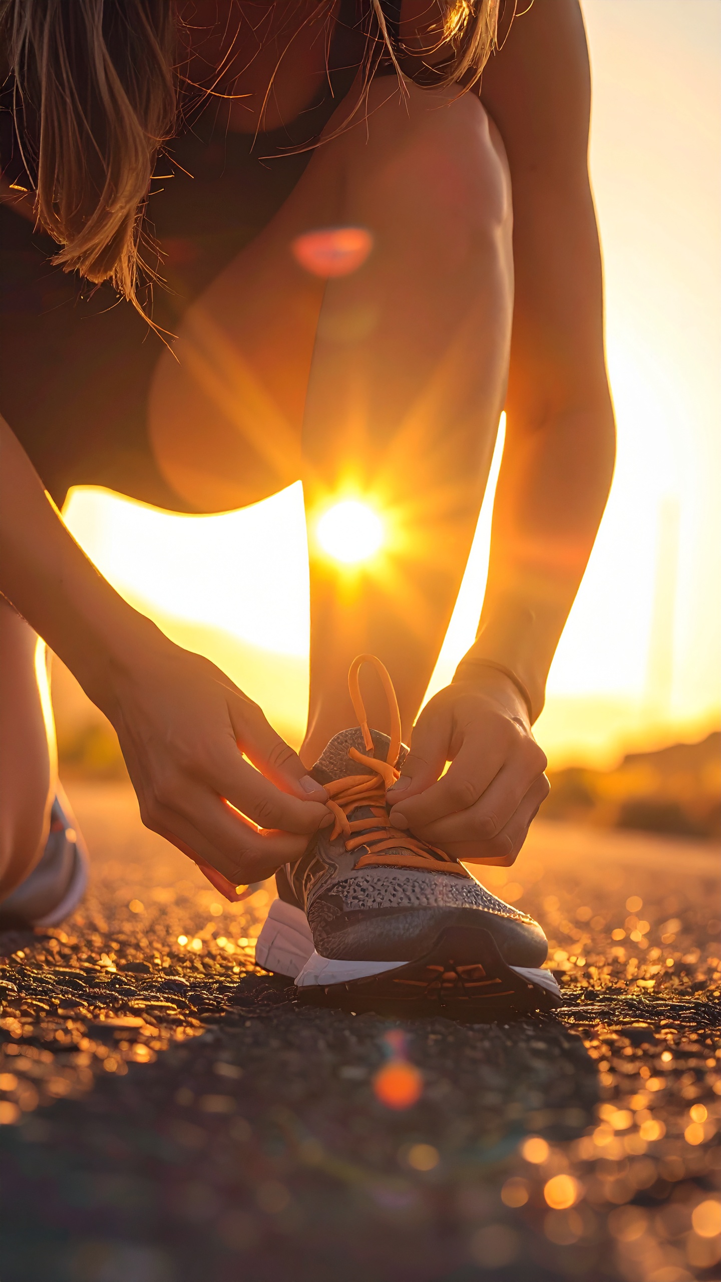 Uma mulher amarra seus tênis de corrida em uma estrada ao por do sol, com iluminação dourada e reflexos quentes. A composição captura um momento de preparação com foco suave, destacando a textura do solo e a postura concentrada.