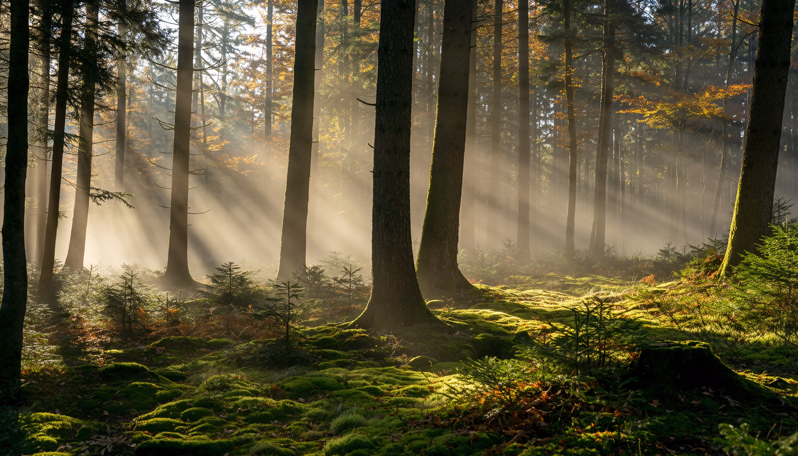 Discover a serene forest featuring tall trees with soft sunlight filtering gently between the trunks. The ground is covered in vibrant green moss, creating a magical and tranquil atmosphere. The golden sunlight enhances the natural textures and depth of the scene, while soft shadows create patterns.