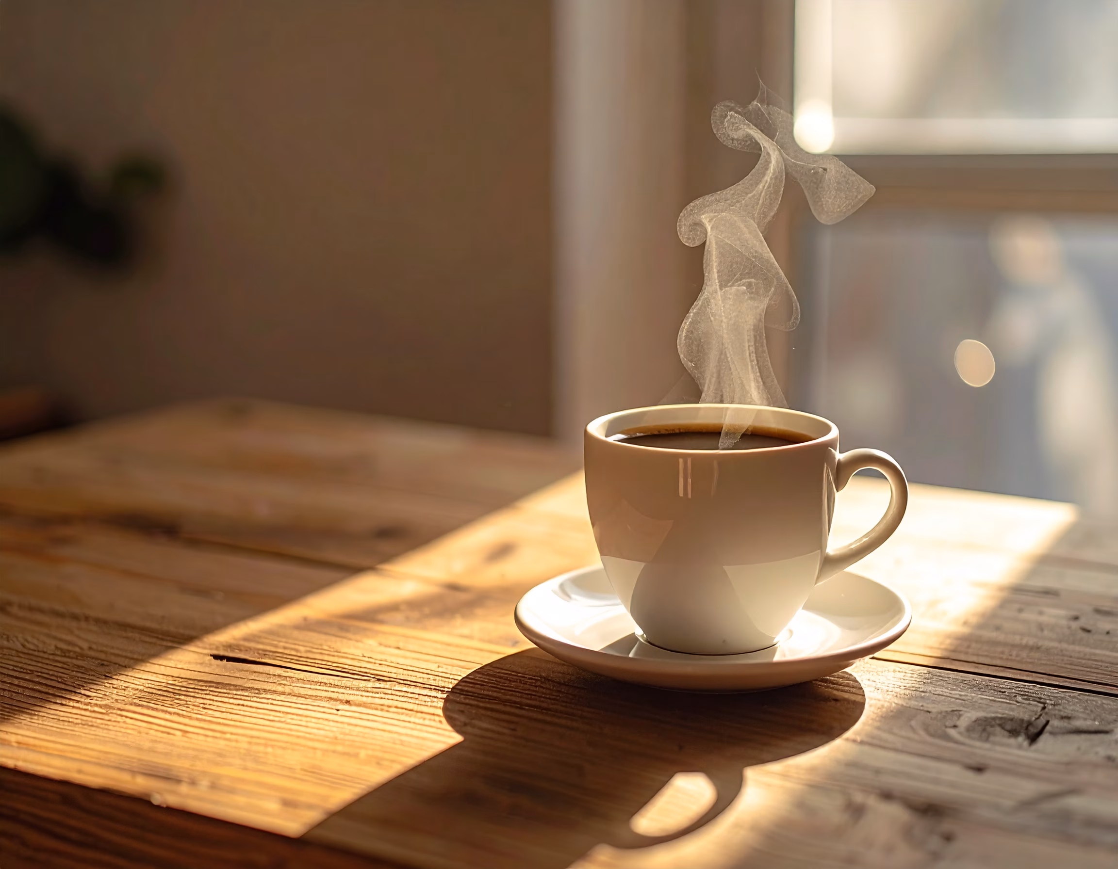 A steaming coffee cup rests on a wooden table illuminated by soft natural light coming through the window, creating a cozy atmosphere. The swirling steam contrasts with the wood texture, highlighting ...