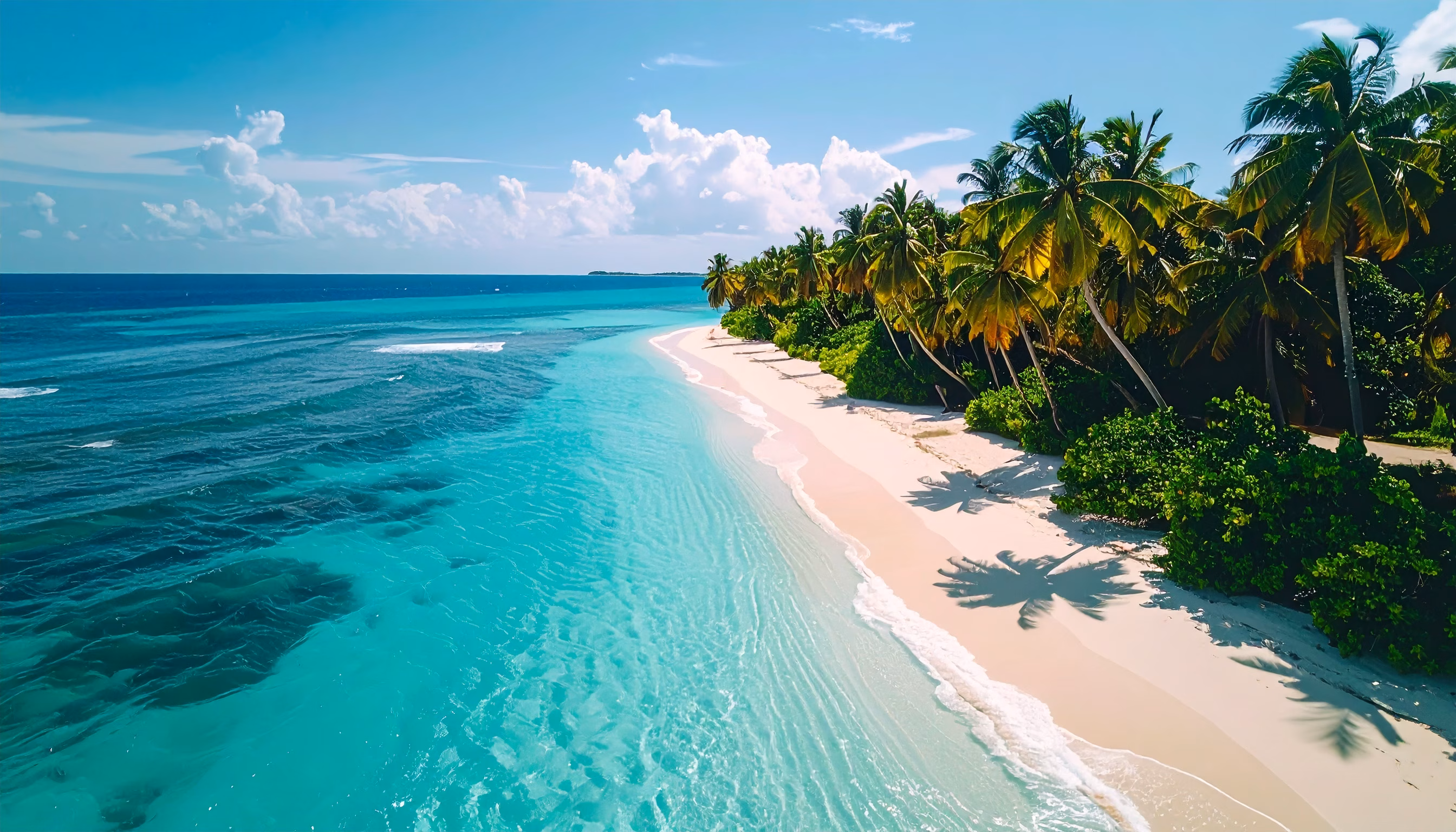 Discover a stunning tropical beach featuring white sand and a vibrant turquoise sea, surrounded by lush green palm trees under a clear blue sky. This image captures tranquility and natural beauty from...