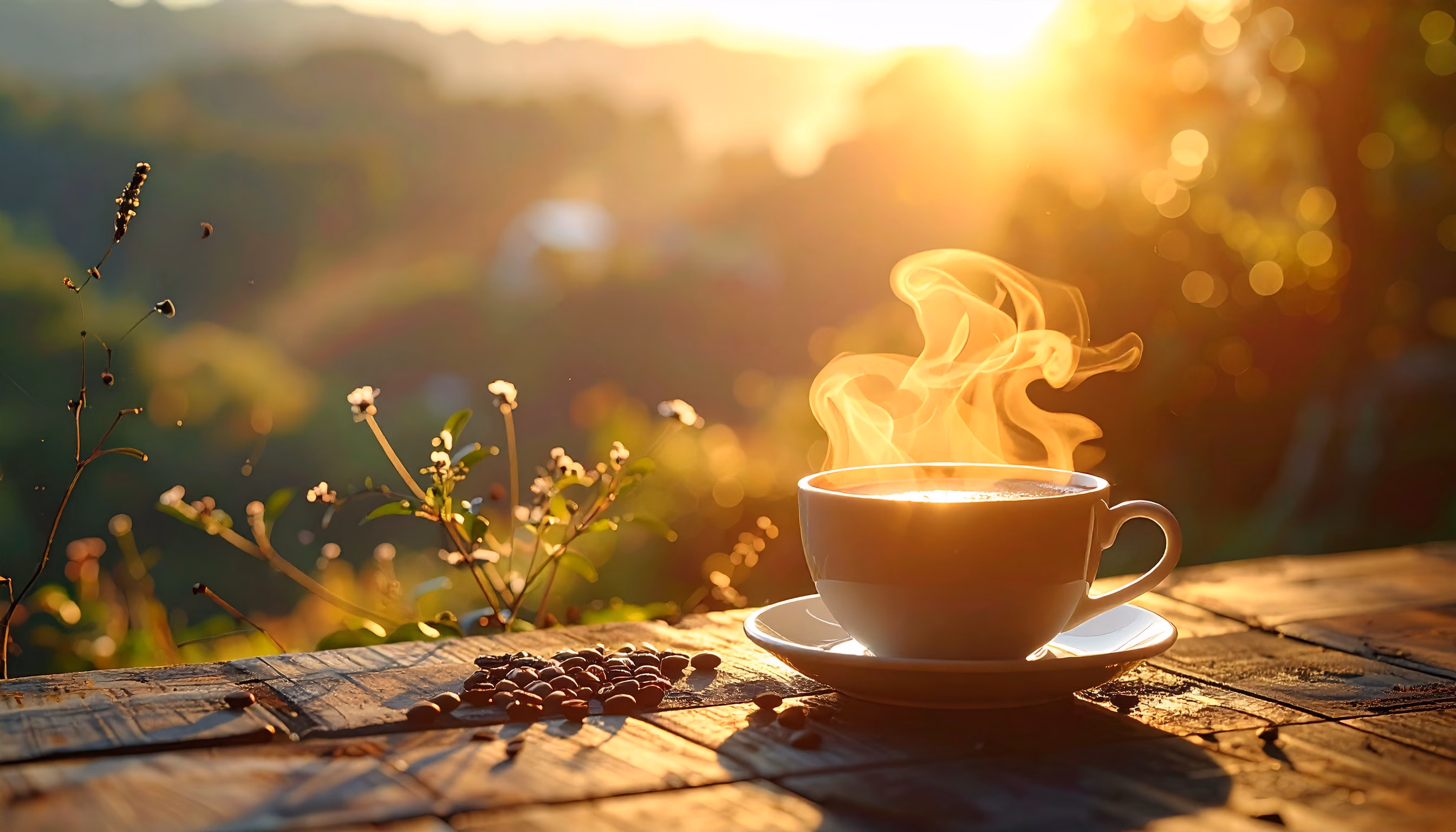 Experience the warmth of a hot coffee cup releasing steam on a rustic wooden table outdoors. Surrounded by coffee beans and lush greenery, this scene is beautifully illuminated by the golden sunrise, ...