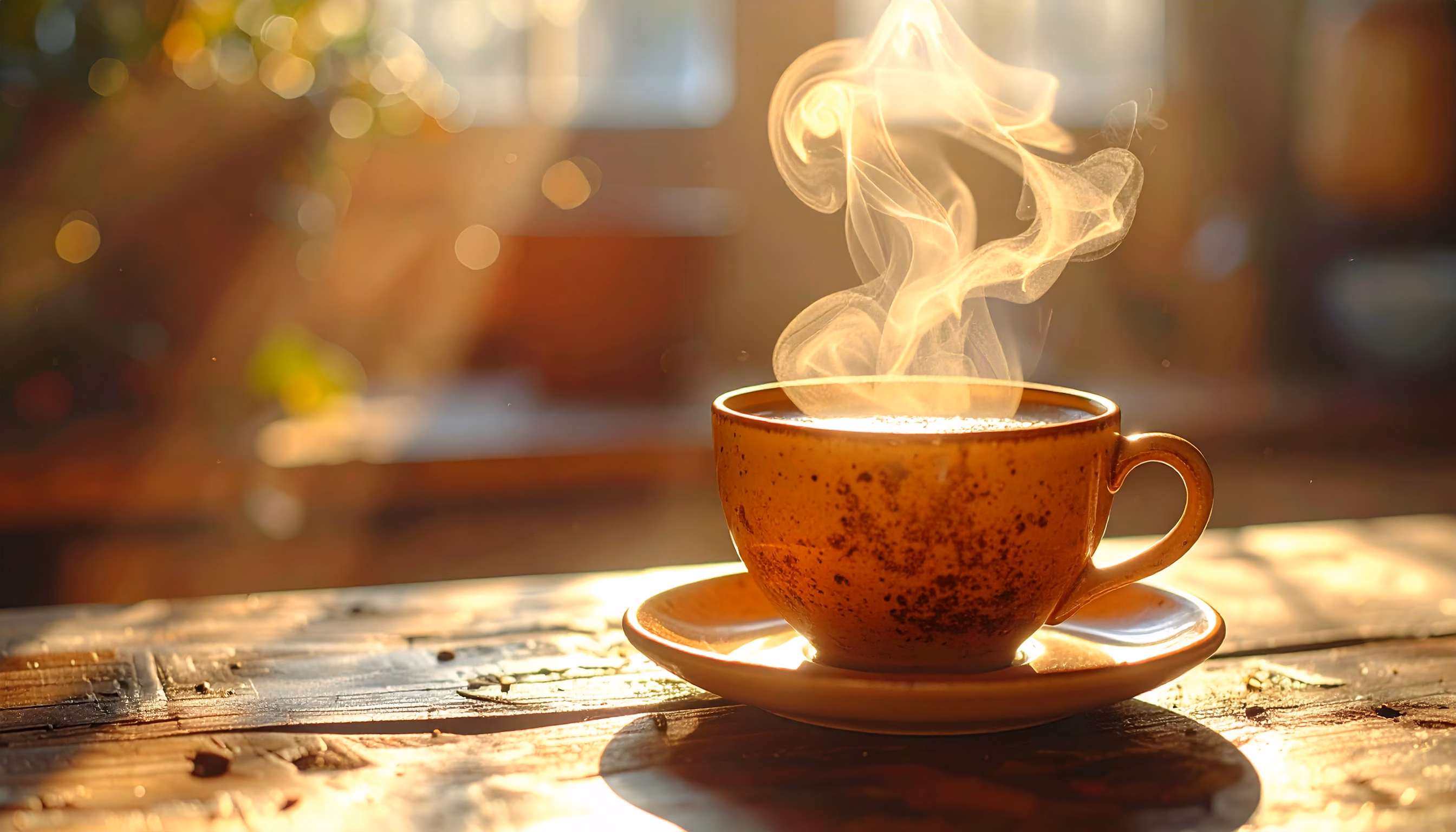A steaming coffee cup placed on a wooden table, bathed in soft sunlight, evoking a sense of warmth and relaxation in a cozy setting. Perfect for those looking to create a comforting atmosphere in thei...