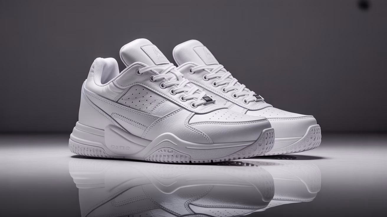 Discover these modern white sneakers showcased in a minimalist environment, beautifully reflected on a glossy surface. The soft lighting highlights the textured leather and intricate lace details. With a symmetrical composition and sharp focus, this image exudes elegance and contemporary style, a go