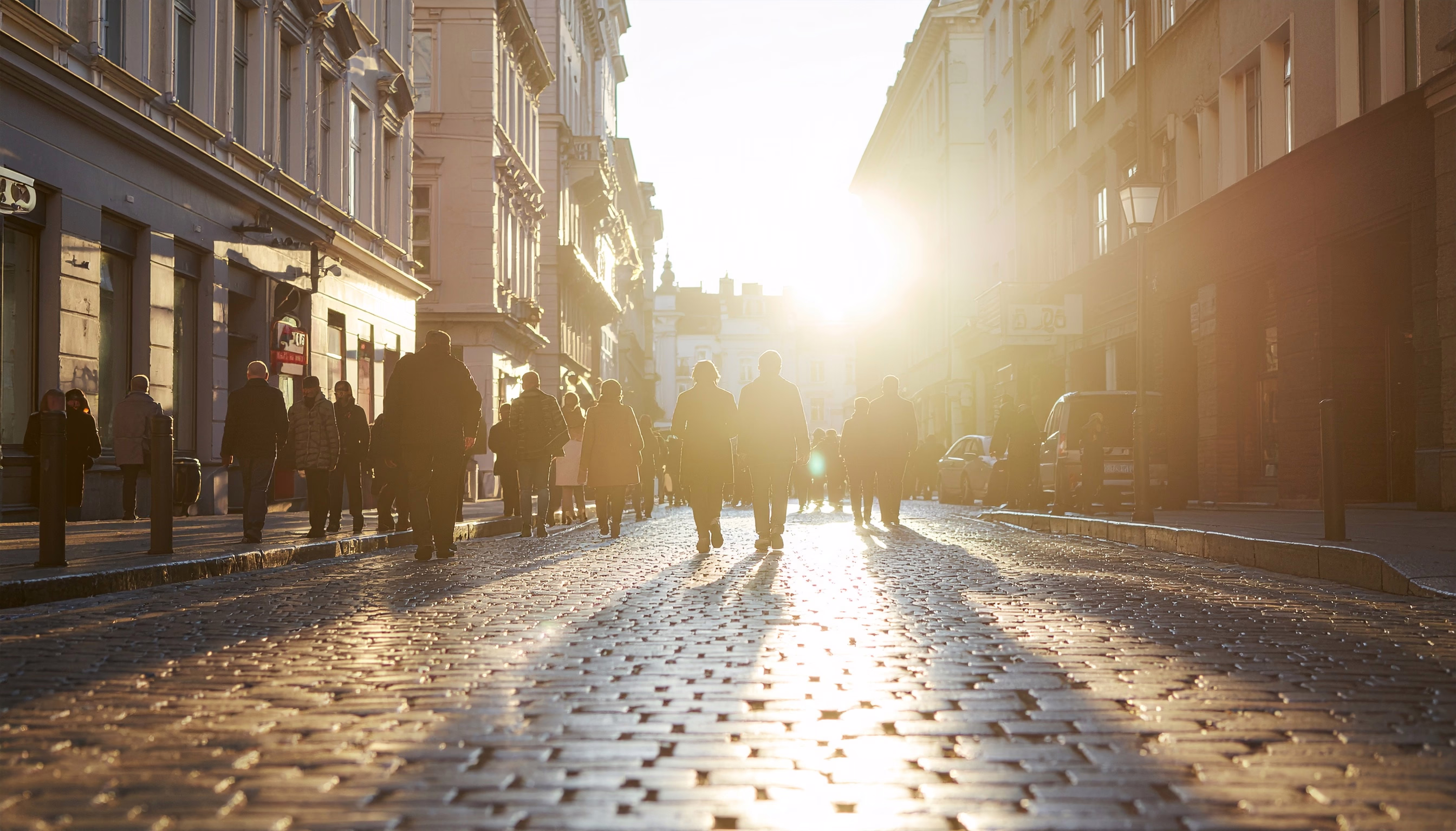 Ideal for showcasing city life and promoting tourism in metropolitan areas. The image captures the warm glow of the sun through a cobblestone street filled with people. Perfect for use in travel brochures or city lifestyle branding. The interplay...