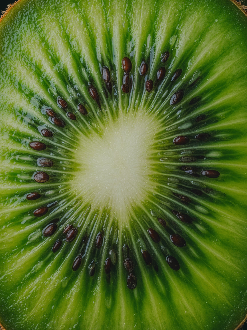 Close-up of a vibrant green kiwi slice revealing its intricate pattern