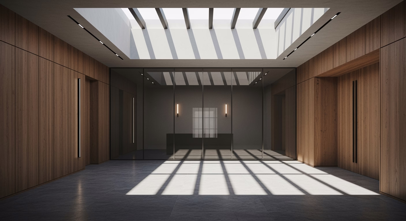A modern interior features sleek wooden paneling and large windows that cast geometric shadows