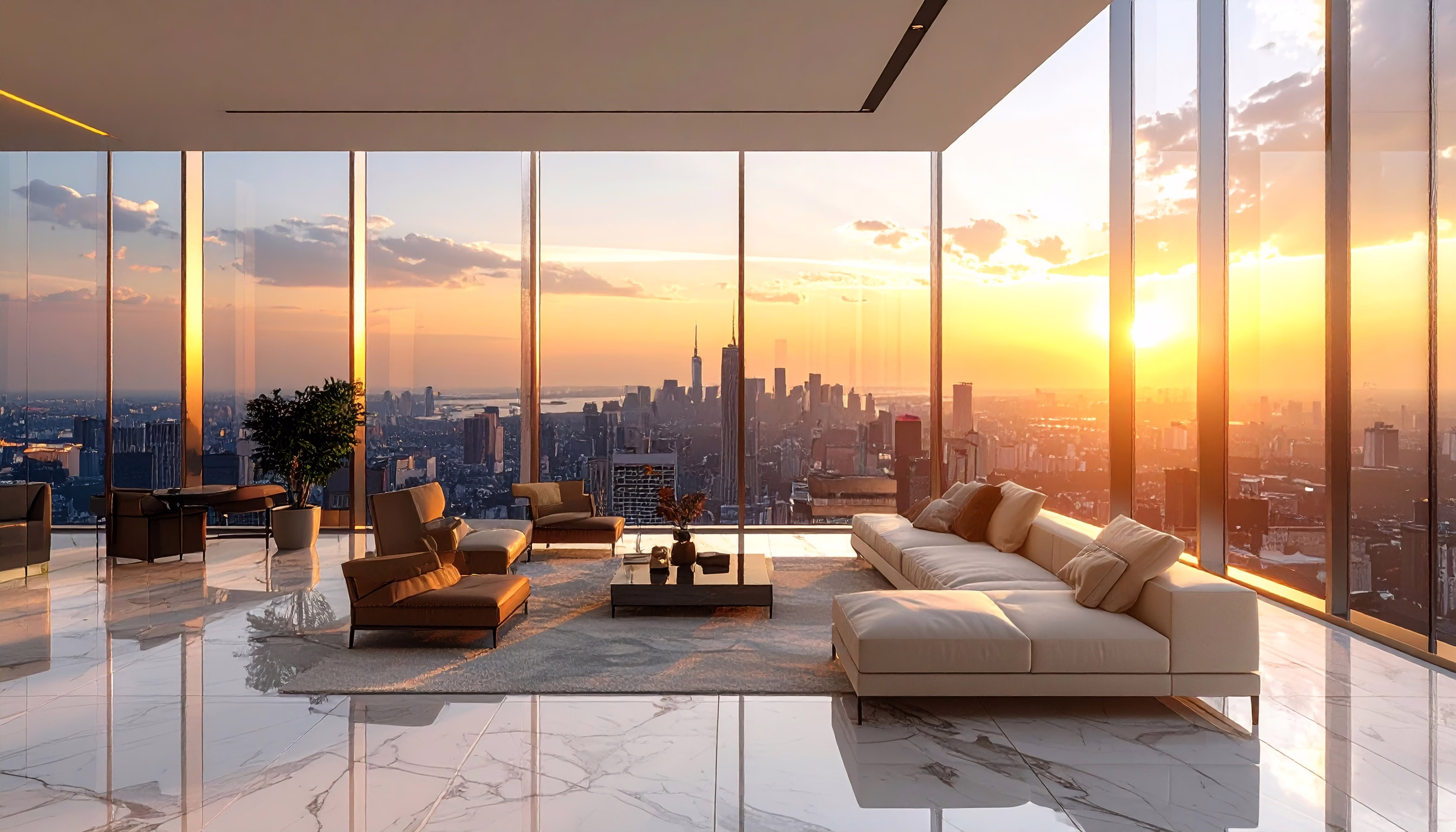 Luxurious modern living room with panoramic city views at sunset