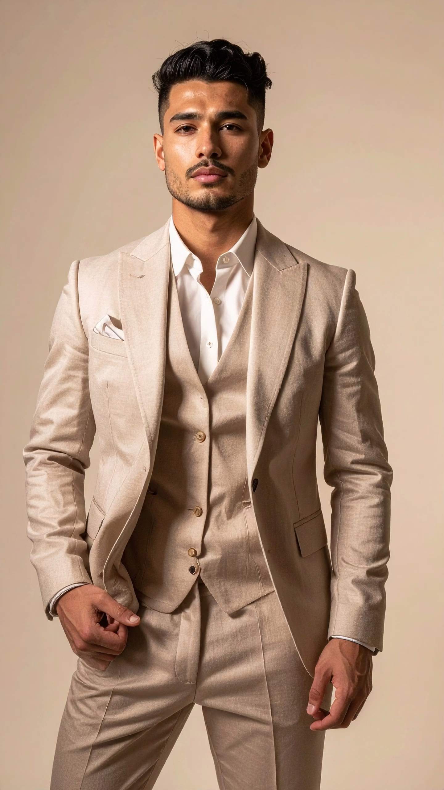 A man wears a tailored beige suit against a neutral background, exuding elegance and style
