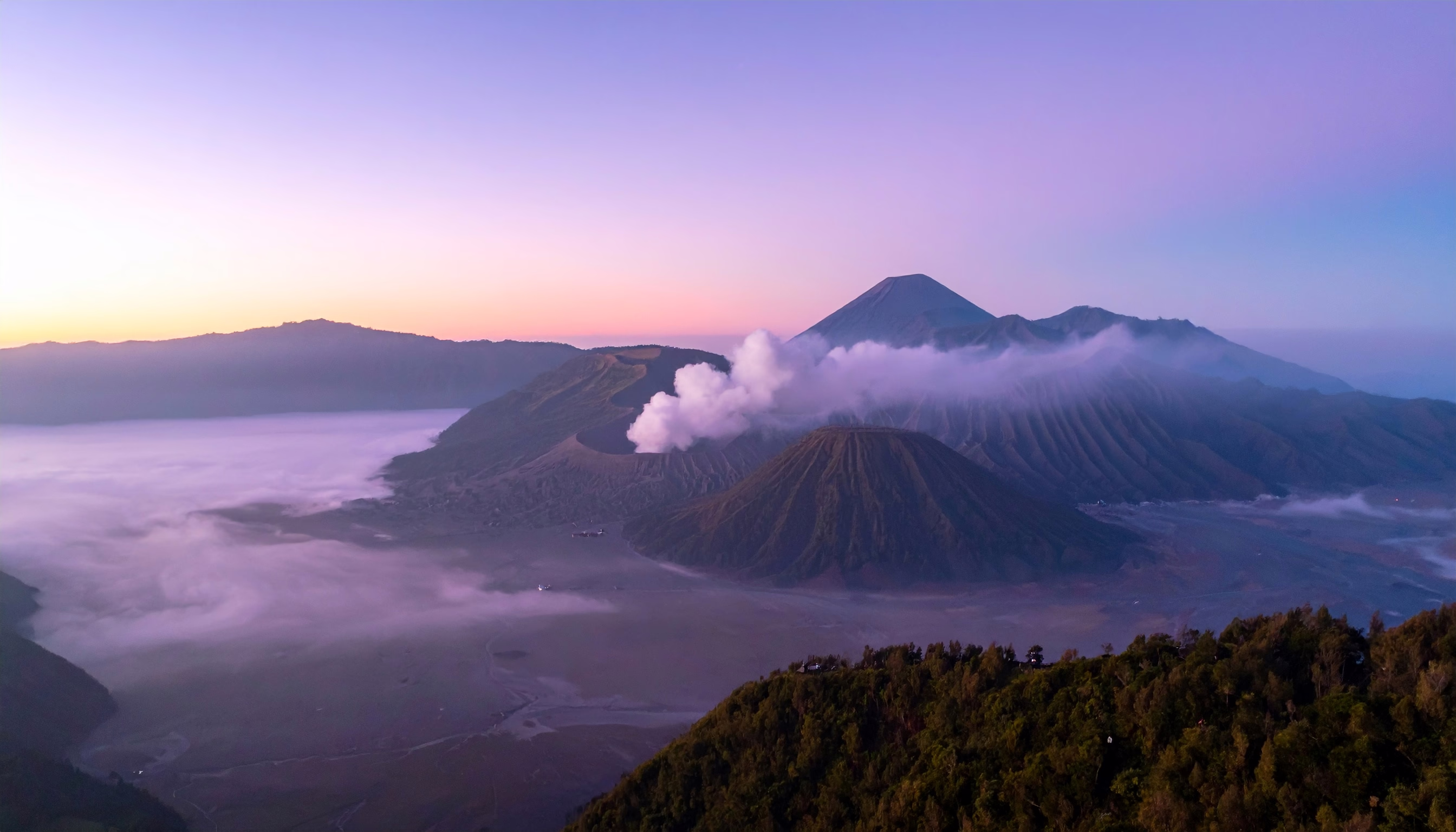 Majestic view of Mount Bromo at sunrise with soft pink and purple hues