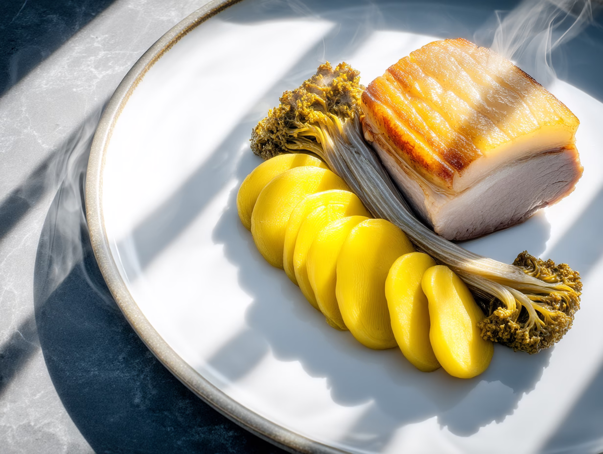 This image showcases an elegant dish featuring succulent meat, slices of a yellow vegetable, and a green side on a light background. Natural light enhances the textures and colors of the food, creatin...