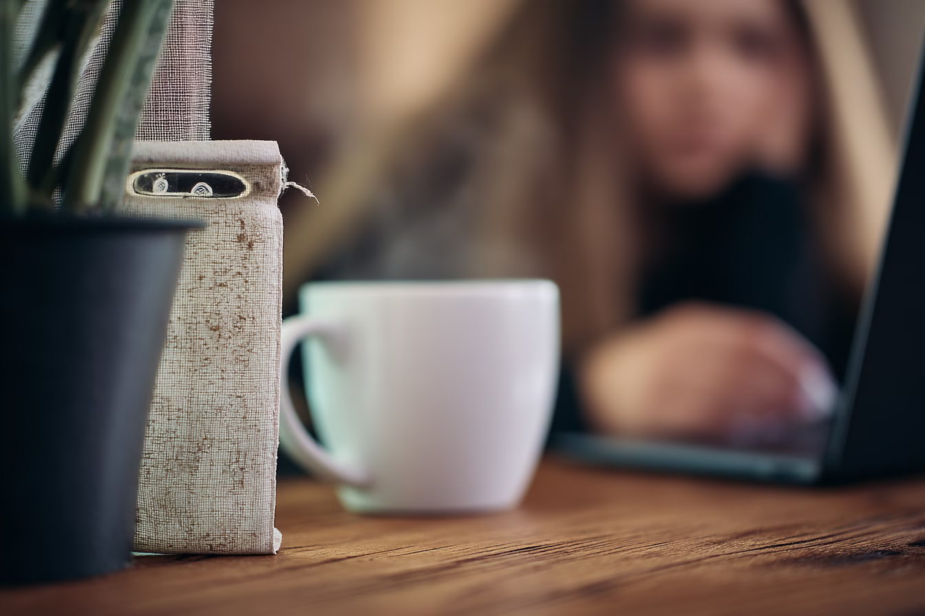 A cozy home office scene featuring a white coffee cup and a fabric container next to a potted plant, with a blurred person in the background using a laptop. The wooden desk creates a warm and inviting atmosphere for productivity.