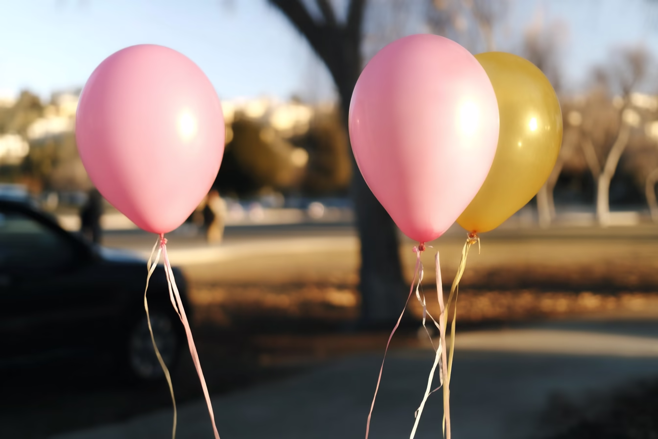 Bright and vibrant colorful balloons in an outdoor park setting, featuring two pink balloons and one yellow balloon against a blurred background of trees and a black car. Perfect for party decorations and outdoor events.