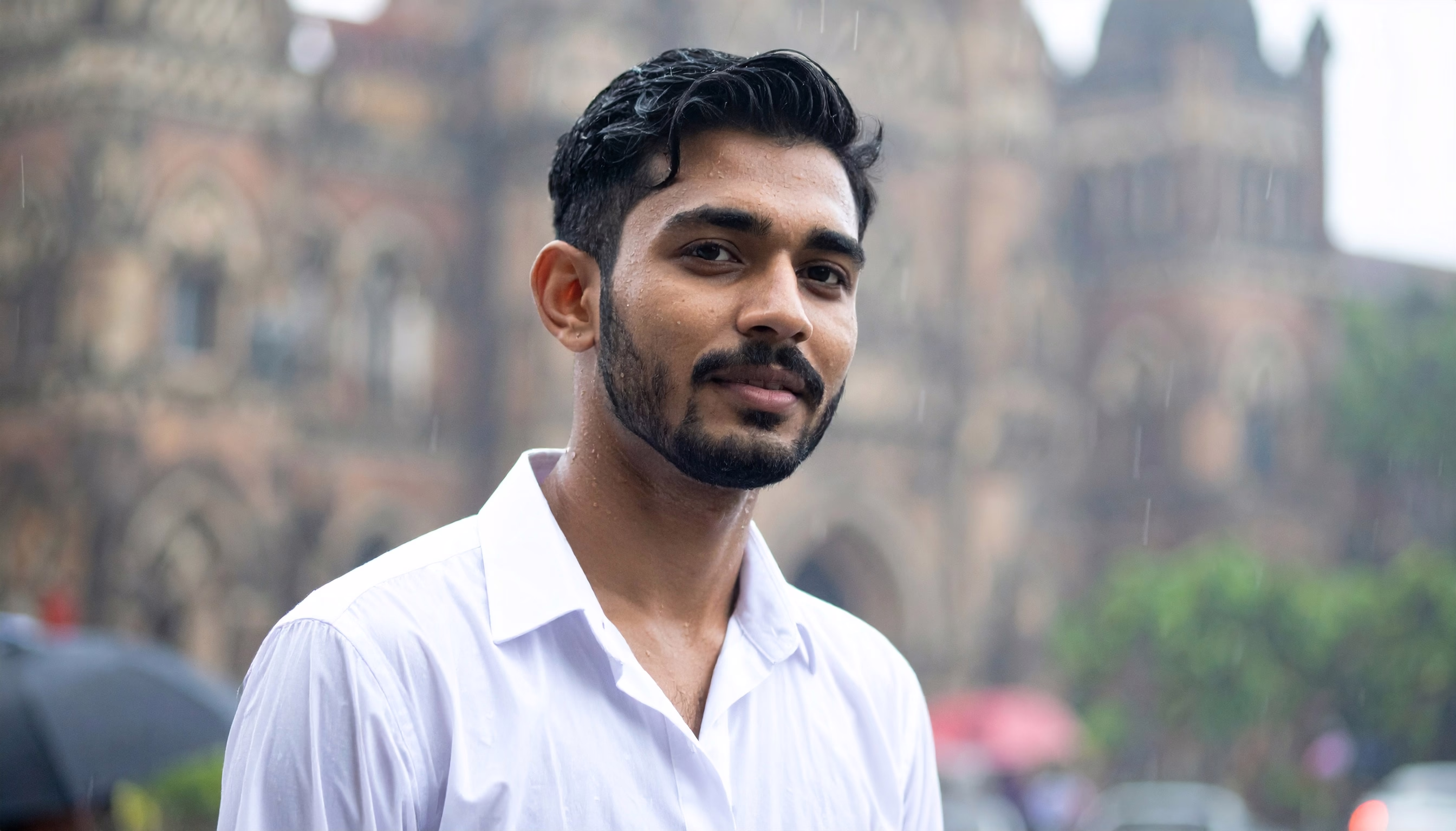 A young man stands confidently in front of a historic building, dressed in a crisp white shirt
