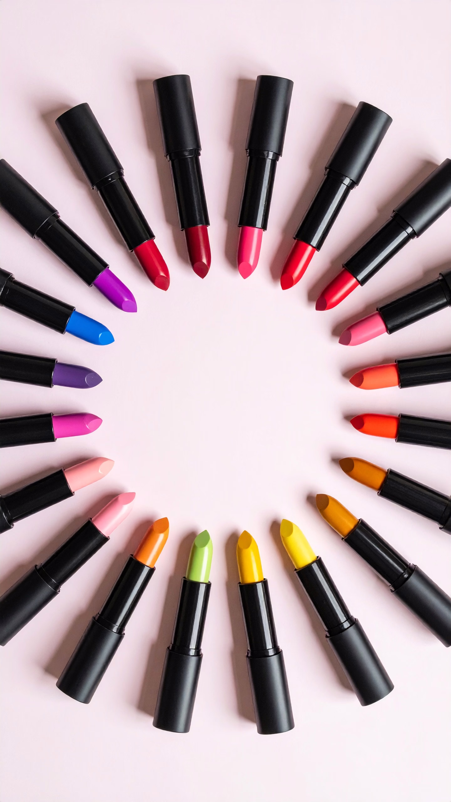 A vibrant array of lipsticks arranged in a circle on a soft pink background showcases